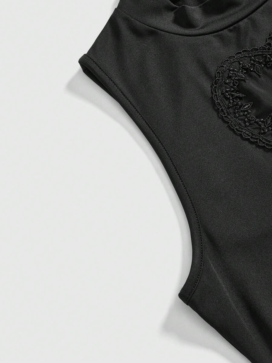 Goth Top da donna in stile vintage gotico, con cuore e croce traforati, patch in merletto ricamato e rete