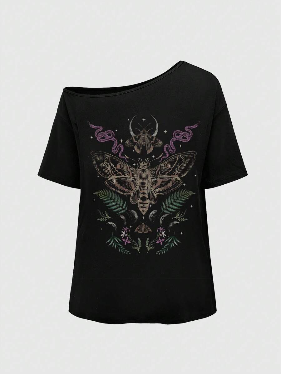 Goth Maglietta asimmetrica casual estiva vintage più taglie, con stampa mistica gotica di strega, falena, serpente e fiori, in nero tinta unita, dalla spalla asimmetrica
