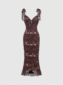 Goth Donna Elegante Vestito Canottiera con orlo a sirena in pizzo, pendente a croce stile palazzo
