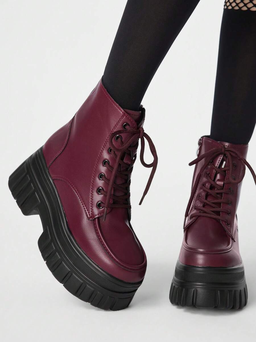 Goth Sandali con tacco da donna ~ Nuova moda autunno e inverno 2026, stile punk in PU bordeaux, stivali da equitazione stile britannico, stivaletti donna con suola spessa, interno rialzato, stile muffin, caviglia sottile