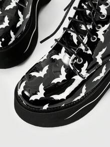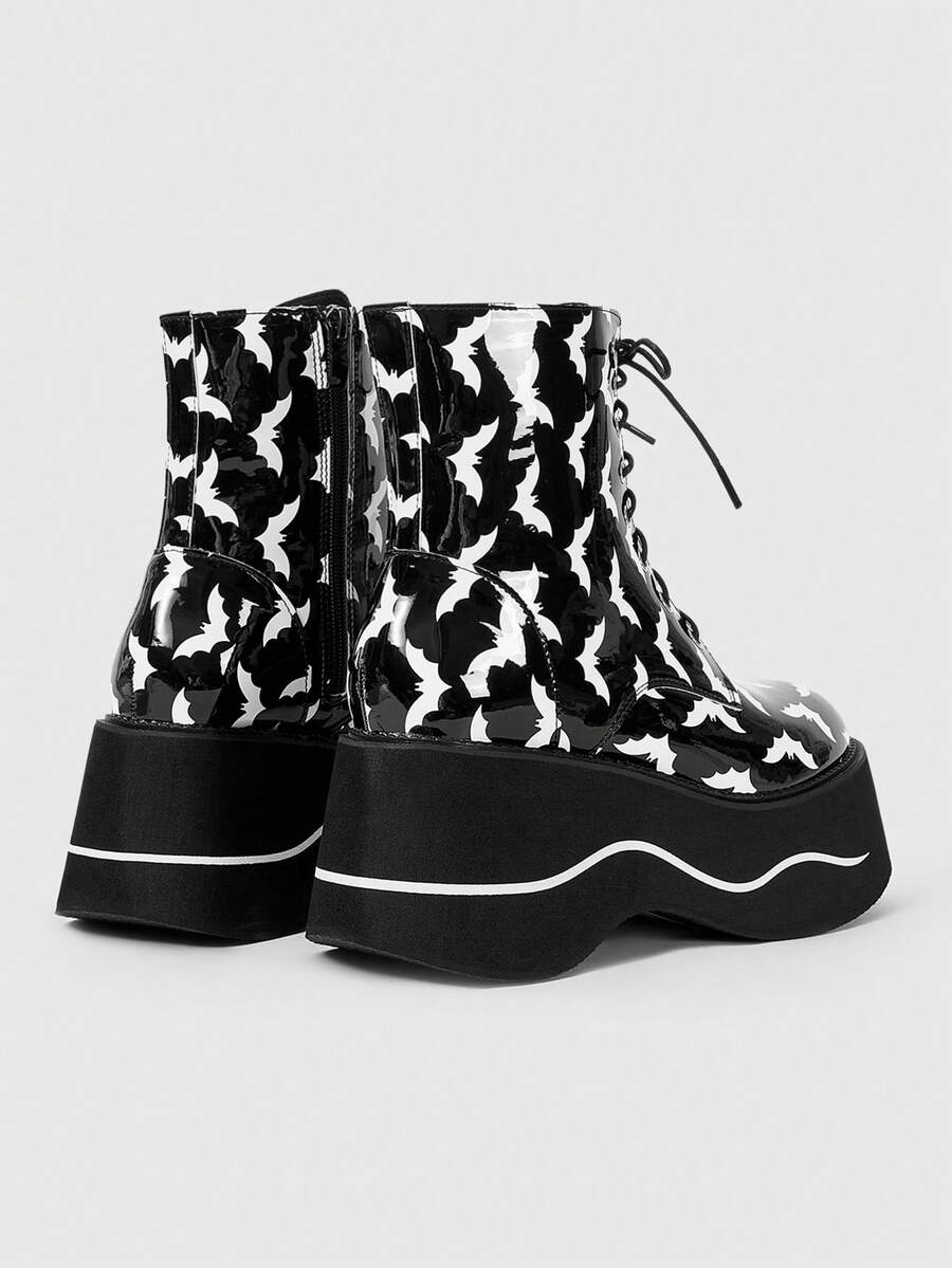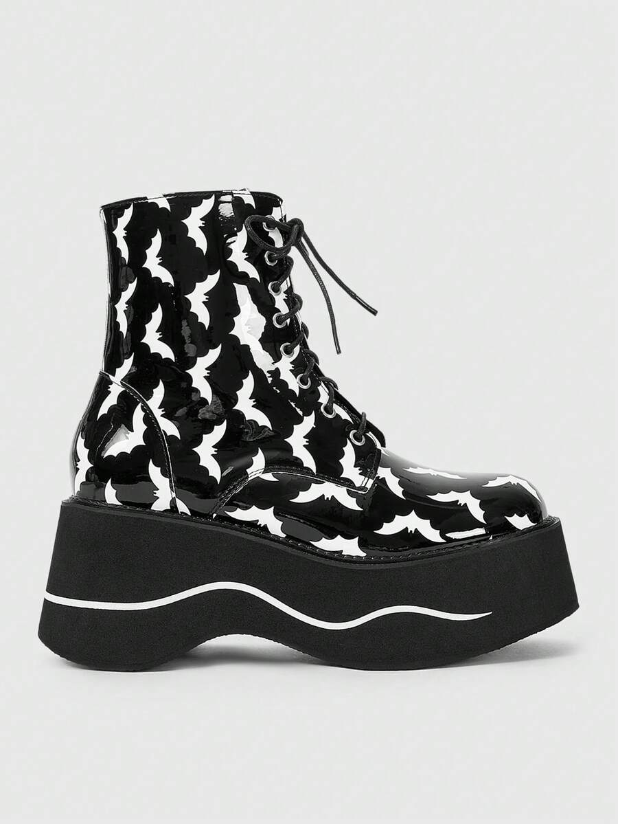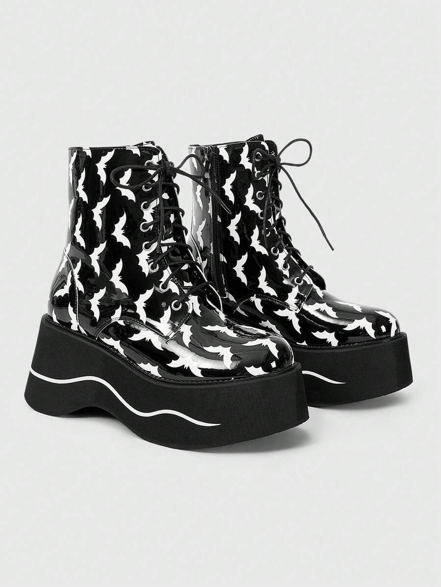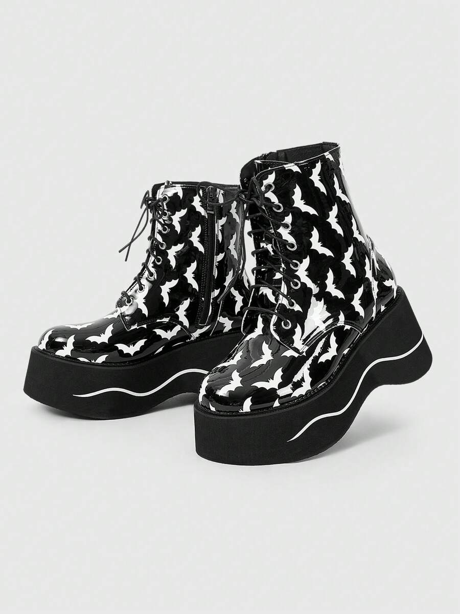 Stivali da donna con zeppa e grafica a pipistrello, stivali alla caviglia stile punk goth con lacci, stivali con zip e tacco alto di Y2K per l'autunno e Ognissanti