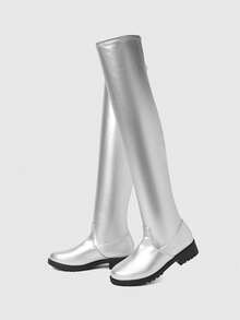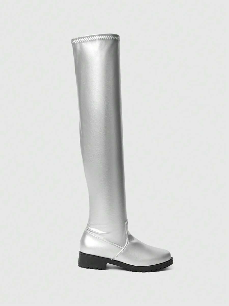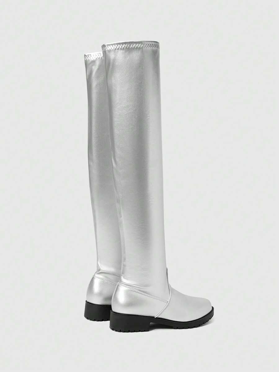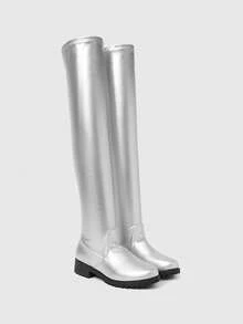 Goth Stivali alti sopra il ginocchio da donna, nuovi arrivi per l'autunno/inverno 2025, punta quadrata, tacco basso, in pelle plissettata, con chiusura a trazione