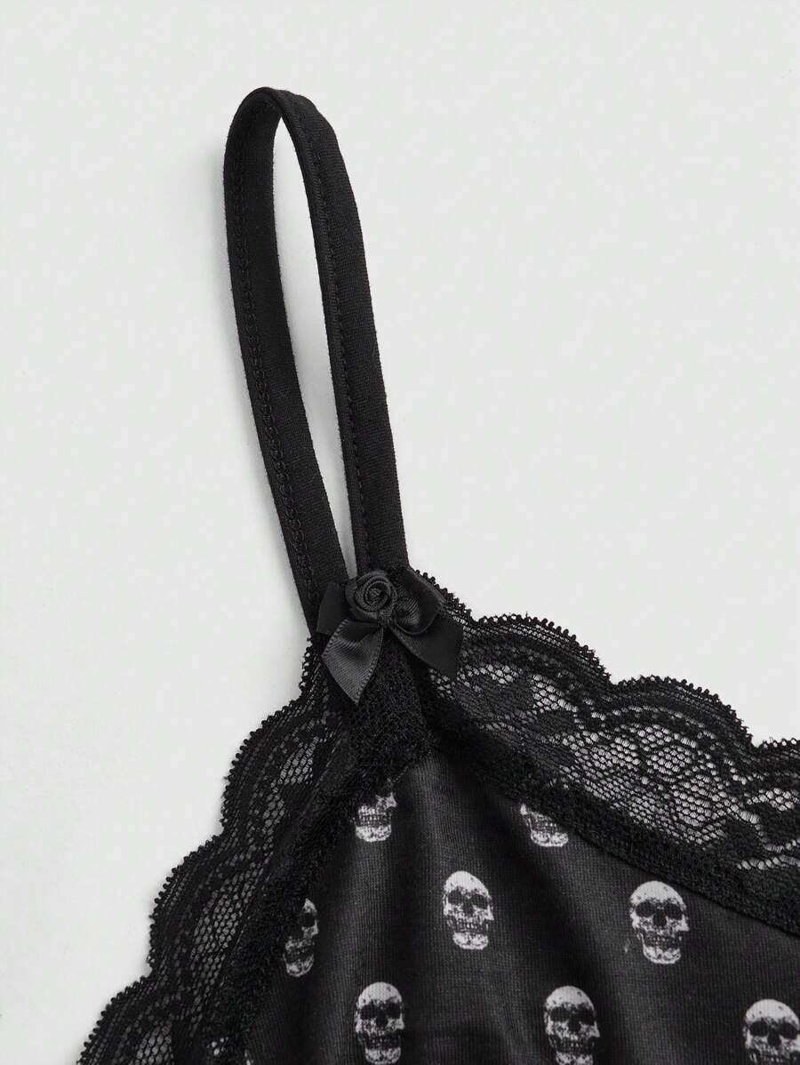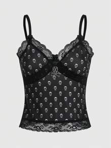 Goth Canotta donna con stampa teschio e bordo in pizzo, scuola