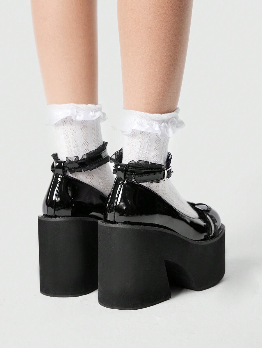 Goth Scarpe da donna Mary Jane con fiocco, rifinite in rete con motivi floreali, punta tonda, tacco con zeppa, stile carino e scuro, colore nero, adatte per uso quotidiano e scolastico, scarpe primaverili, primavera, Pasqua