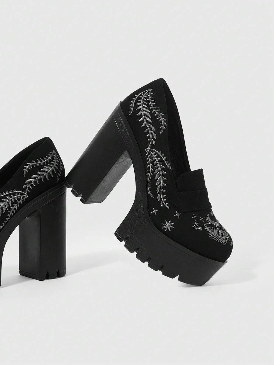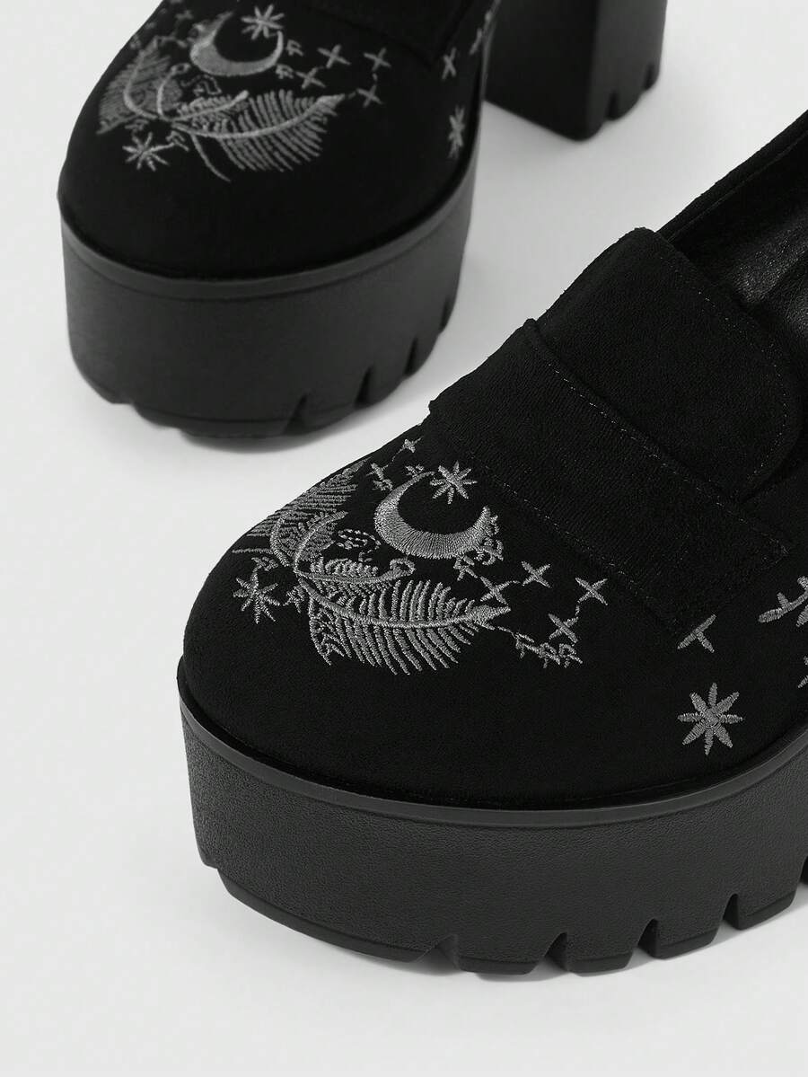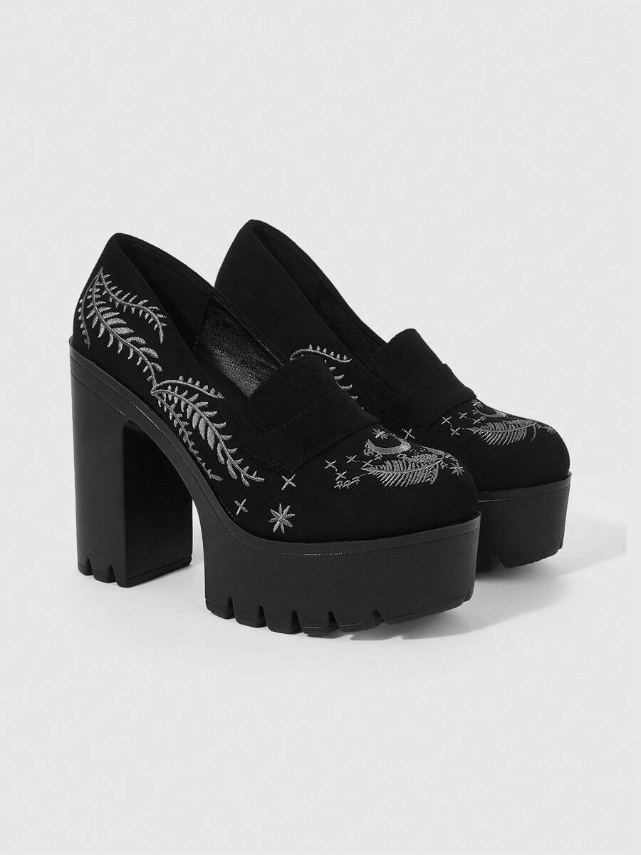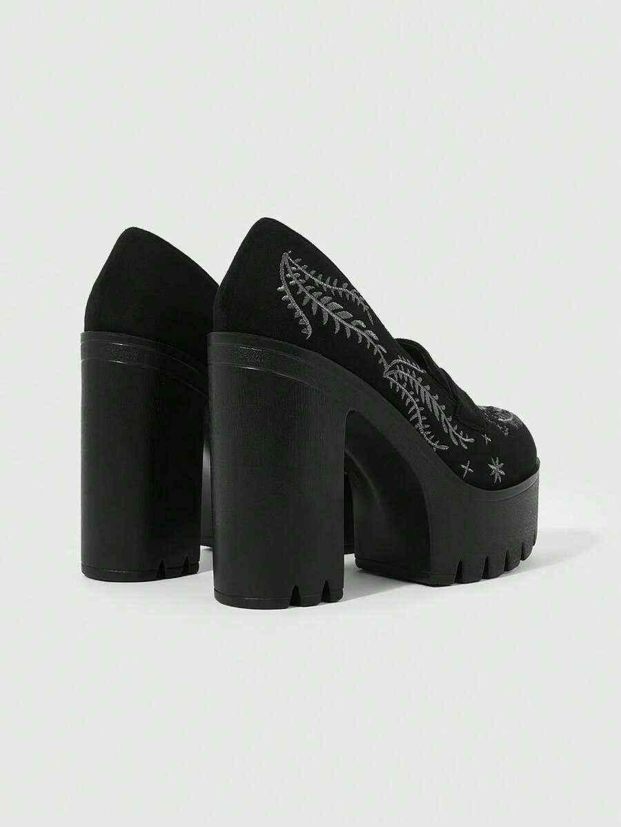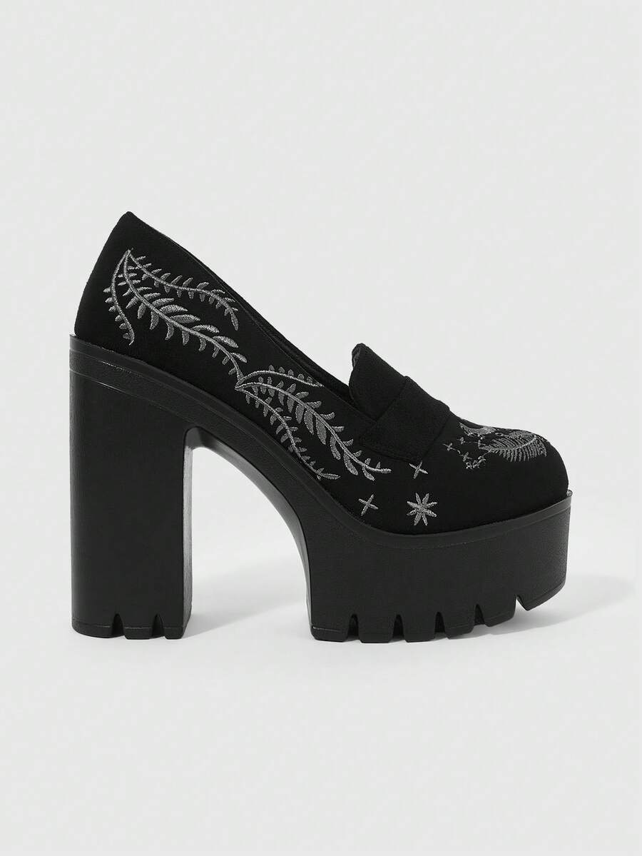 Goth Scarpe con tacco alto da donna di colore unito, con suola spessa e tacco chunky, con cinturino, motivo ricamato a pianta e luna, adatte per la primavera/autunno, scarpe comode con tacco alto