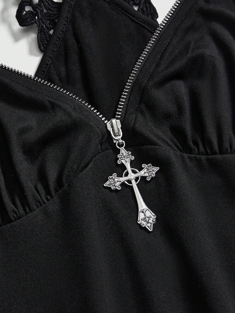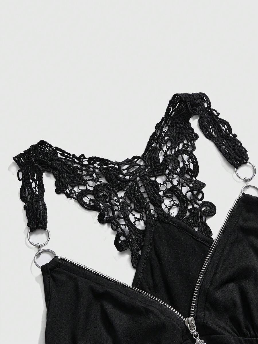 Goth Abito retrò Y2K elegante con colletto a croce, patchwork di pizzo e schiena scoperta