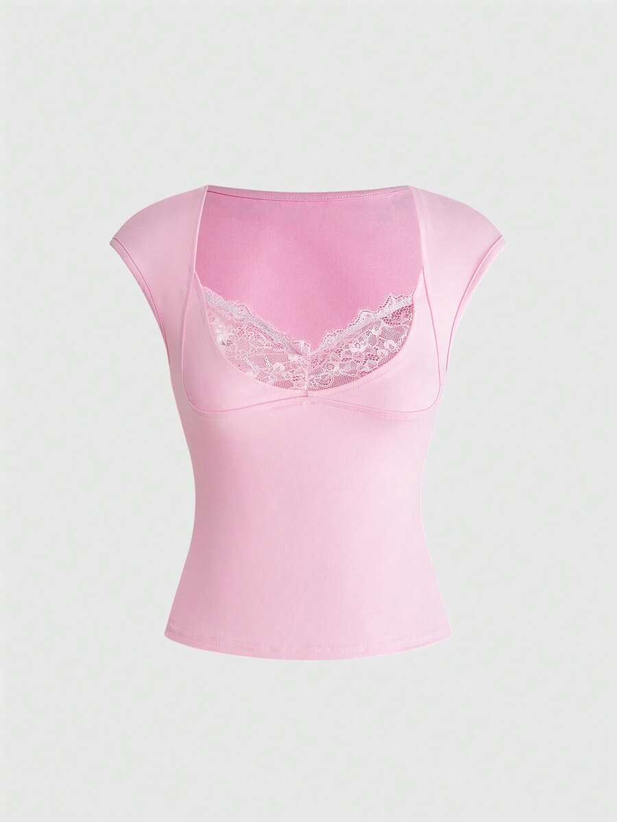 Goth Maglietta aderente da donna con vita raccolta e bordo in pizzo a contrasto, stile versatile e sexy Y2K
