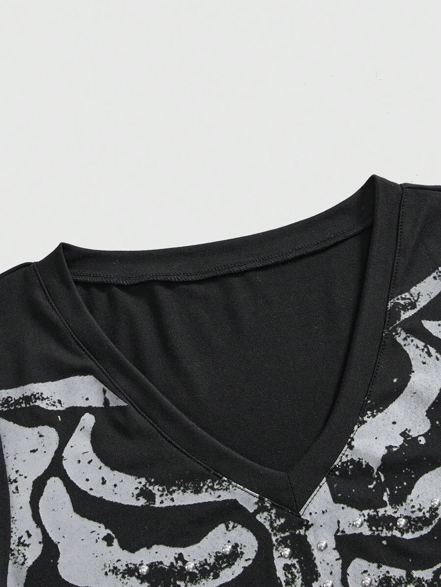 Goth Maglietta da donna vintage punk con scollo a V, con decorazioni d'argento a forma di scheletro