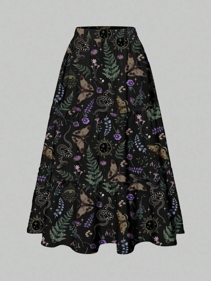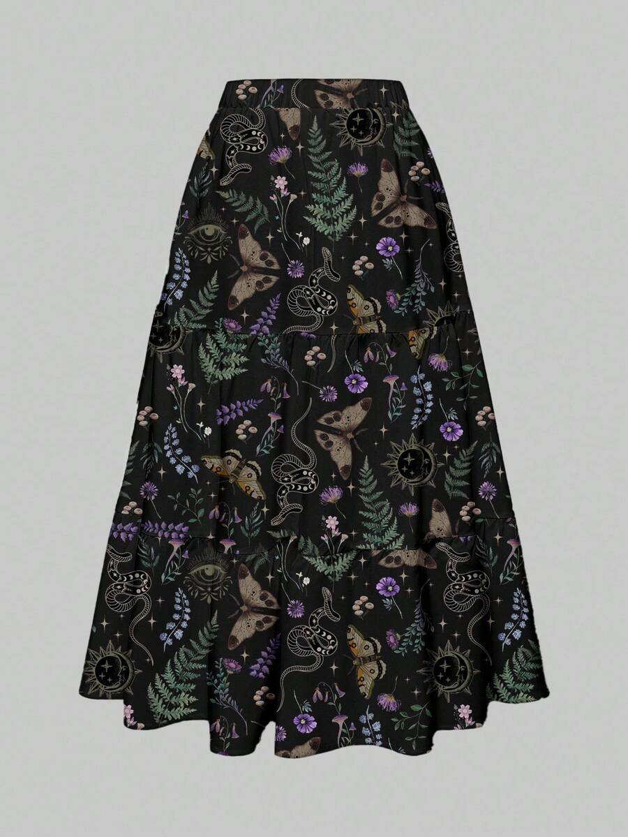 Goth Gonna estiva da donna stile gotico e vintage, con stampe di farfalle, piante, serpenti, stelle, lune ed occhi, in un motivo floreale a 3 strati