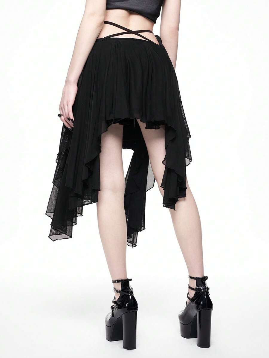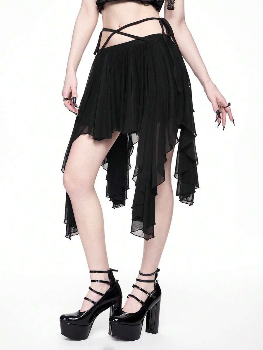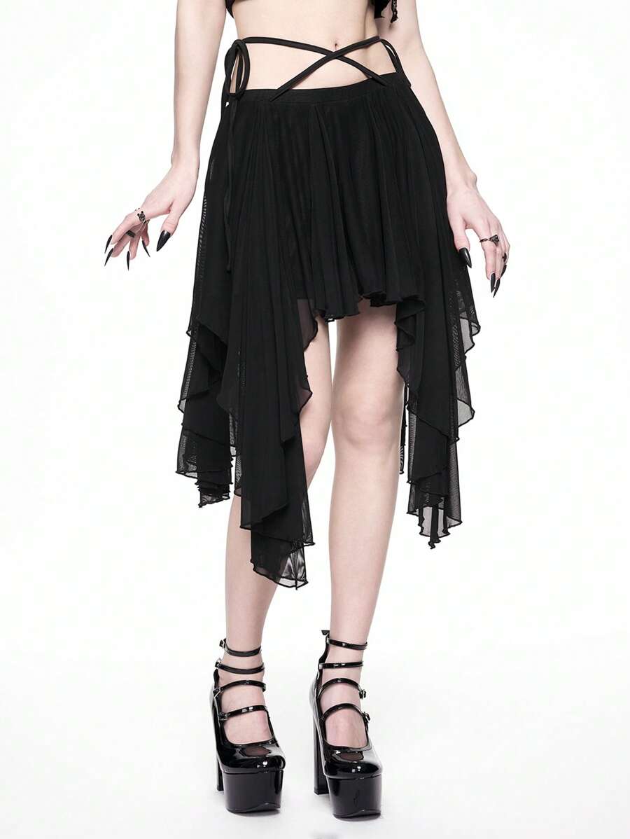 Goth Gonna da vacanza asimmetrica in stile gotico barocco, in pizzo nero, a rete, multistrato, con vita annodata e vita bassa, sexy per le donne