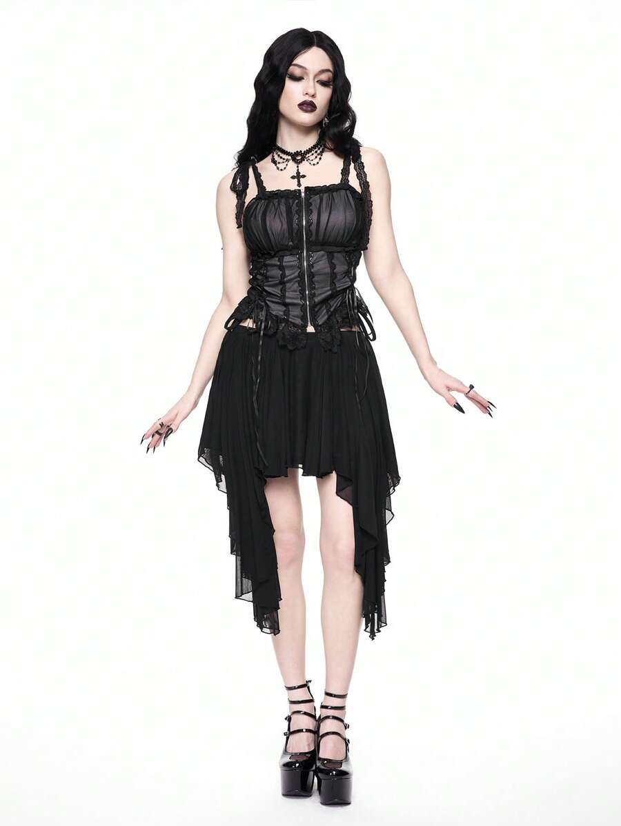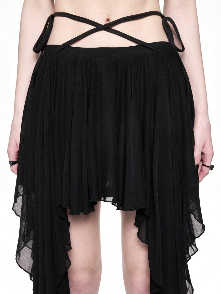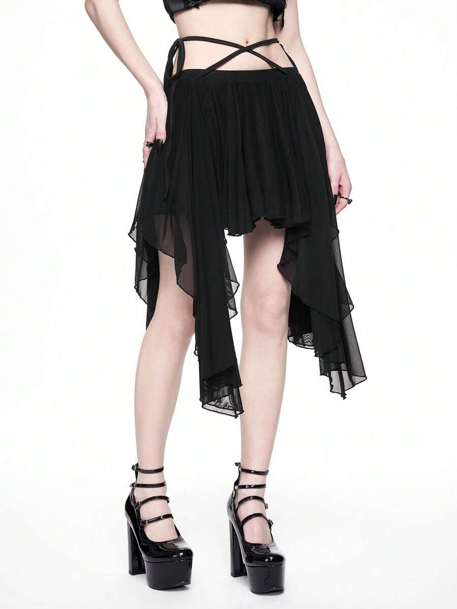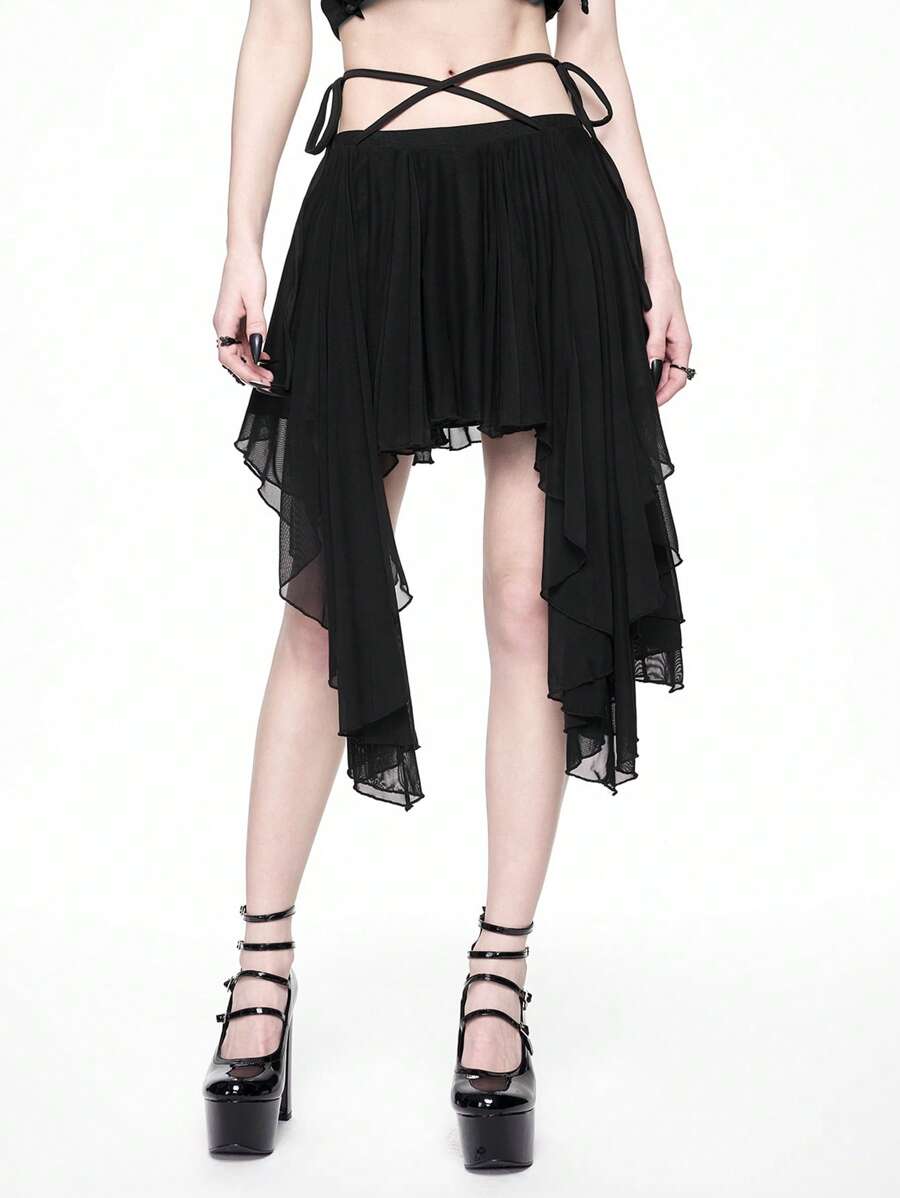 Goth Gonna da vacanza asimmetrica in stile gotico barocco, in pizzo nero, a rete, multistrato, con vita annodata e vita bassa, sexy per le donne