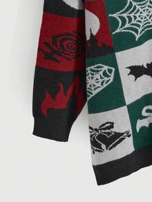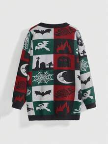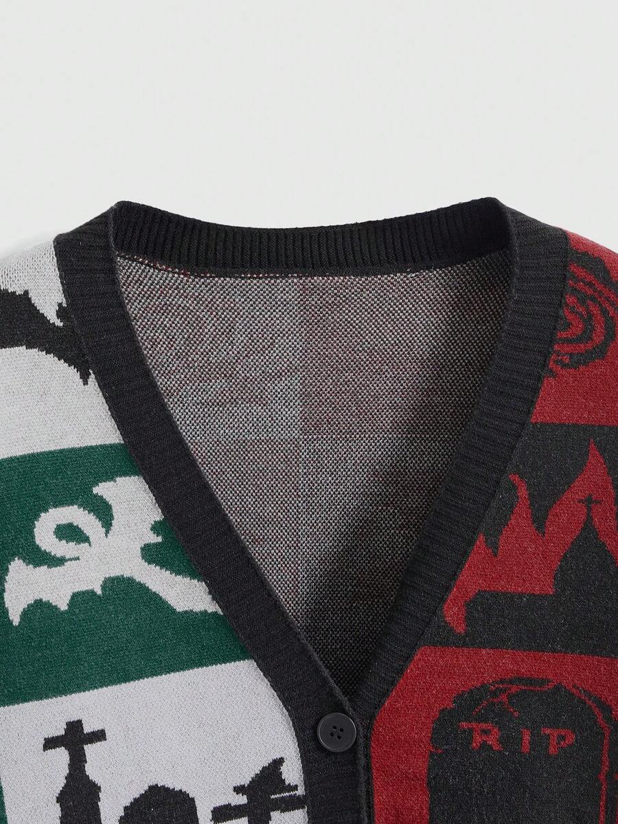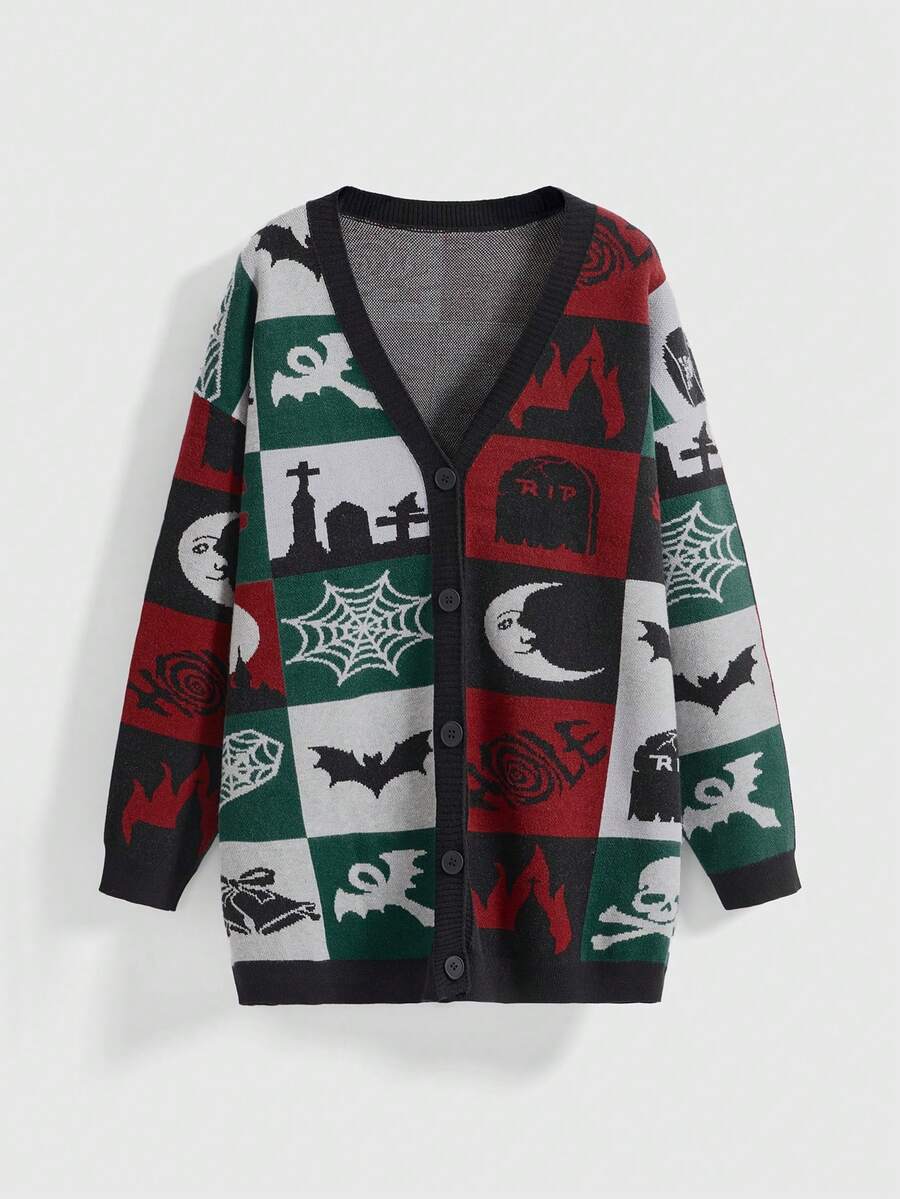Goth Cardigan casual a maniche lunghe da donna in maglia jacquard con motivi gotici di pipistrelli, luna, ragnatela e tombe