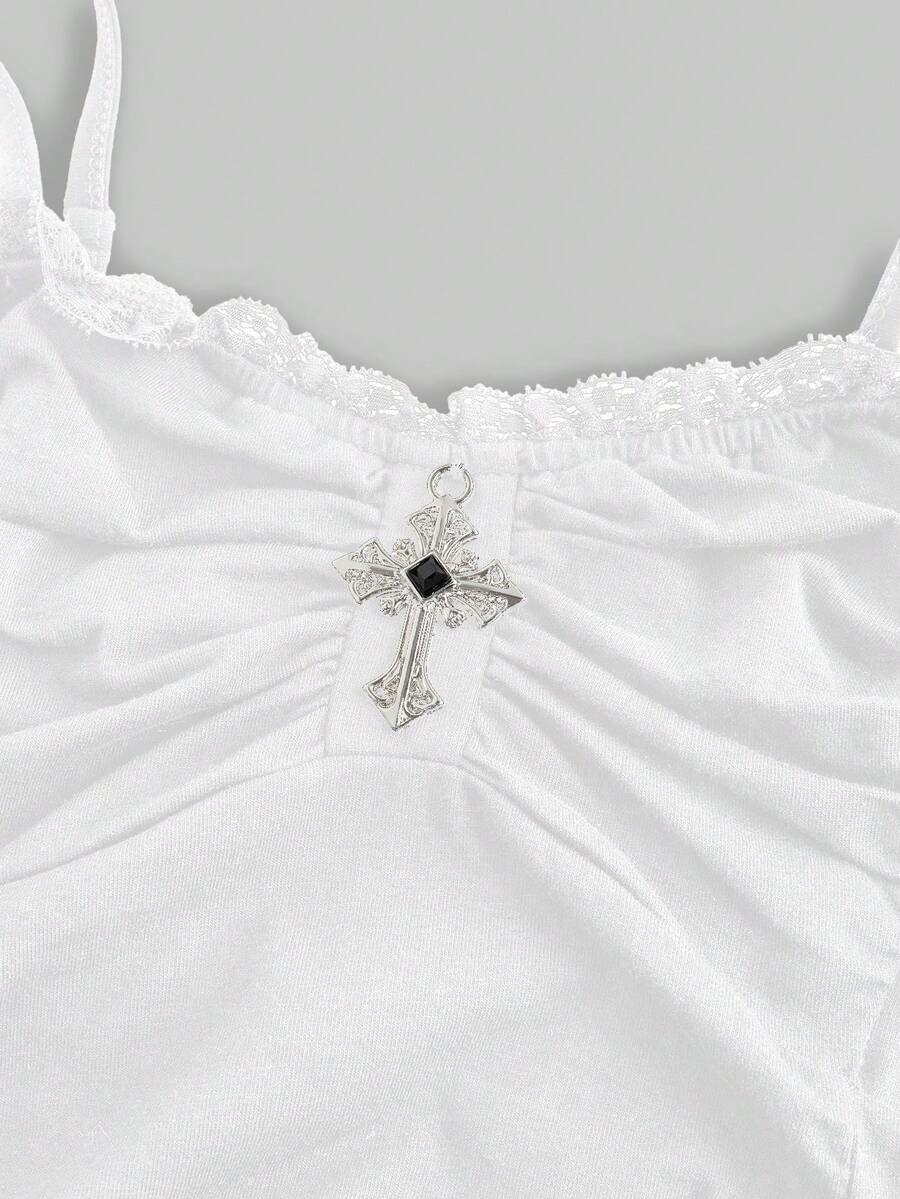 Goth Canotta da donna con dettaglio pendente a croce gotica, inserti in pizzo e arricciatura