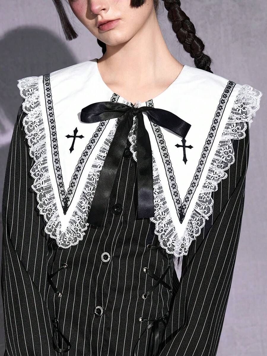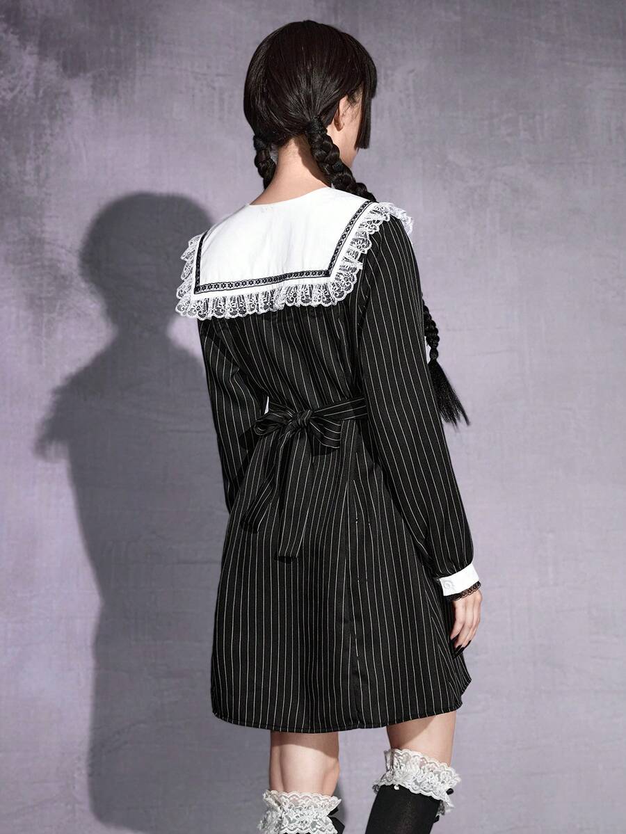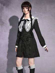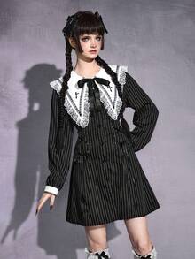Goth Abito mini aderente a-line con colletto a punta, pizzo a contrasto e righe, stile gotico dark doll