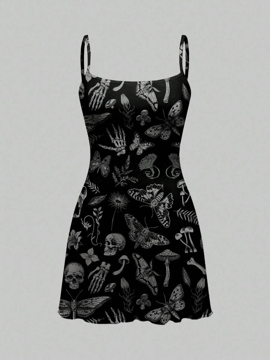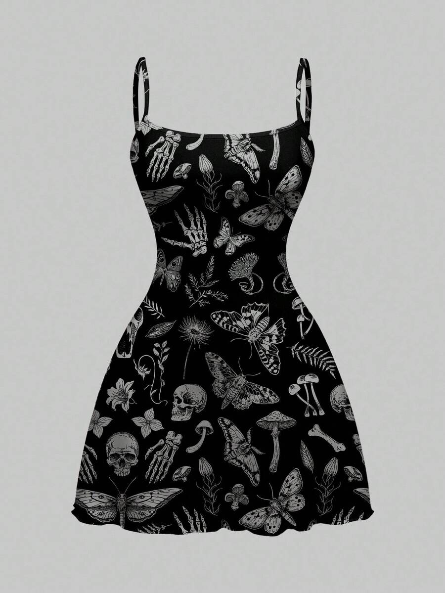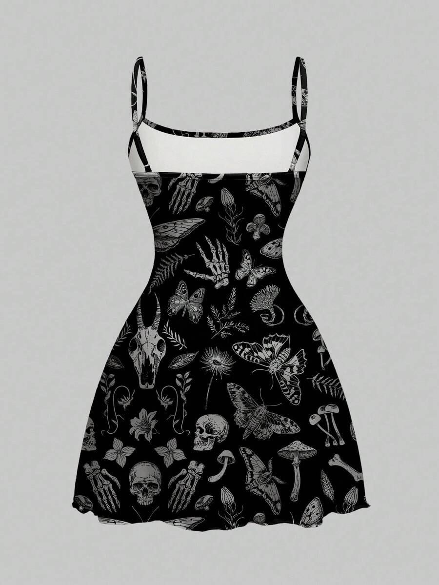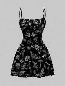 Abito mini da donna con stampa allover di scheletro, ali di pipistrello e piante in stile gotico dark per Ognissanti