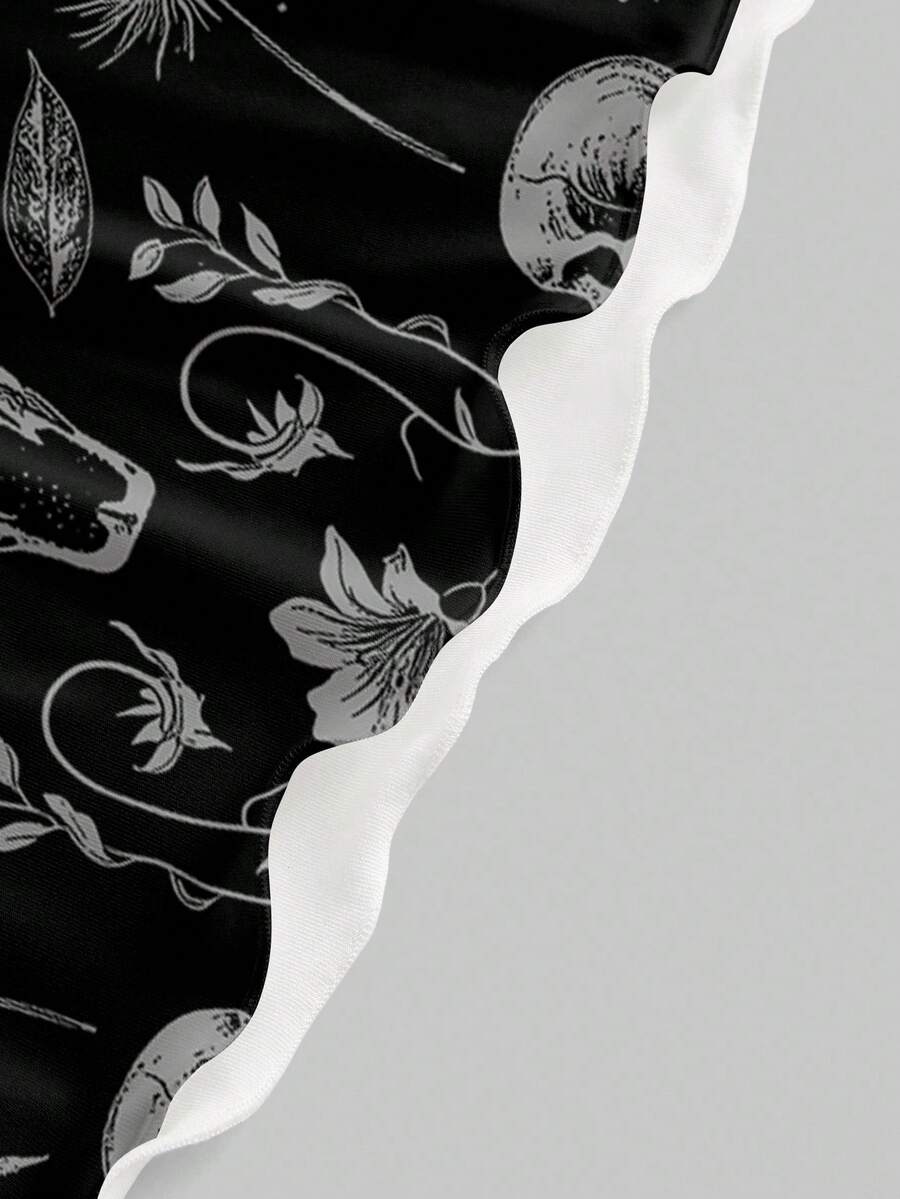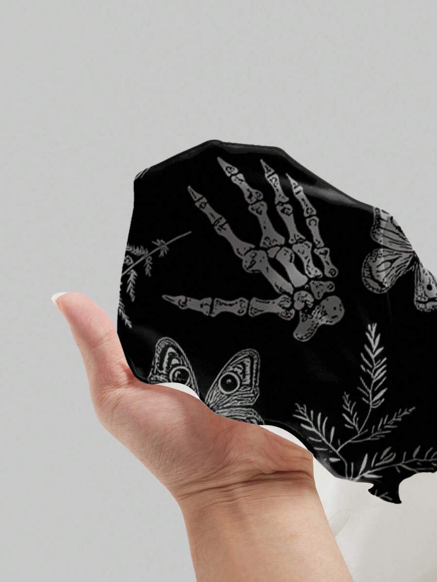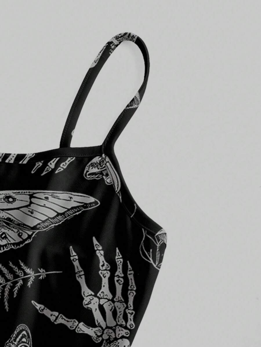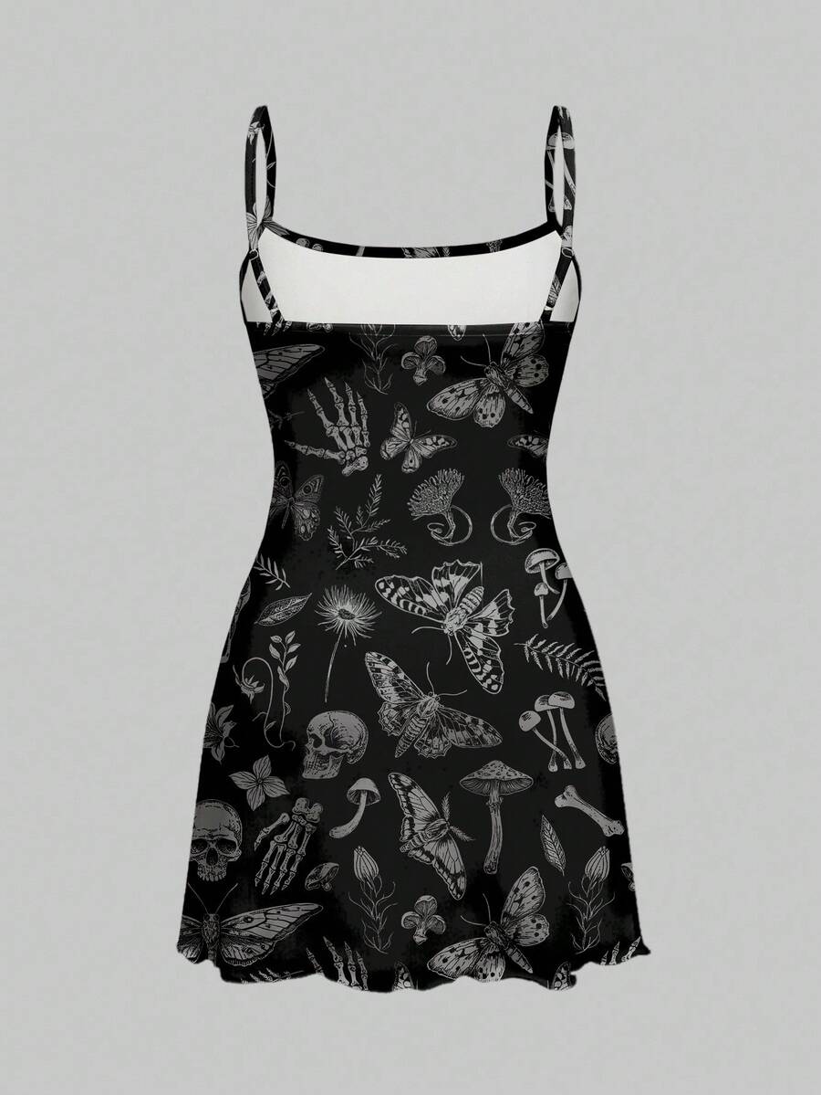 Abito mini da donna con stampa allover di scheletro, ali di pipistrello e piante in stile gotico dark per Ognissanti