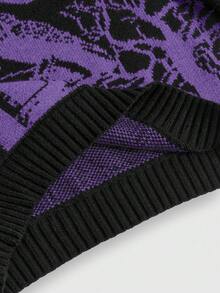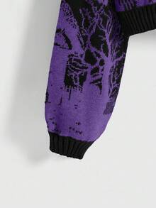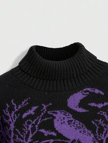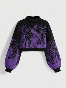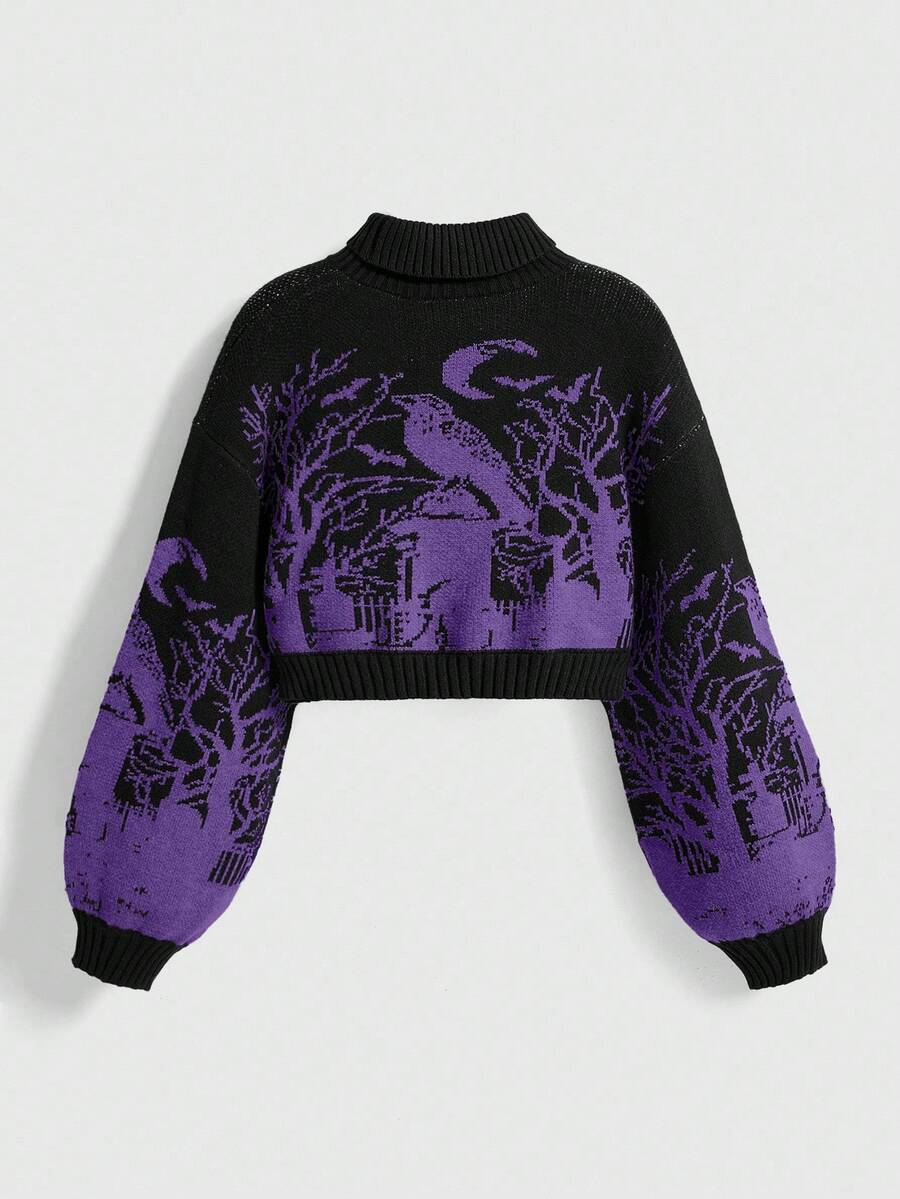 Goth Maglione da donna con maniche a lanterna, collo alto, motivo jacquard con corvi, luna e rami, colore nero, stile gotico