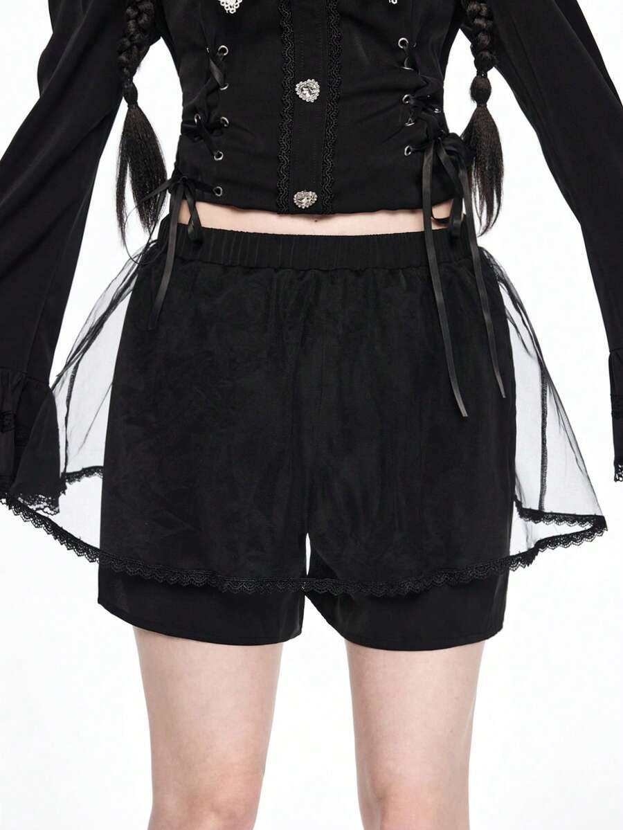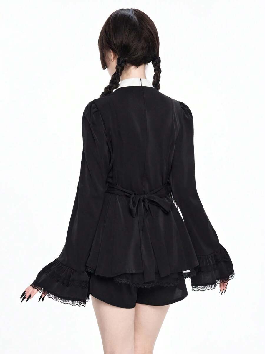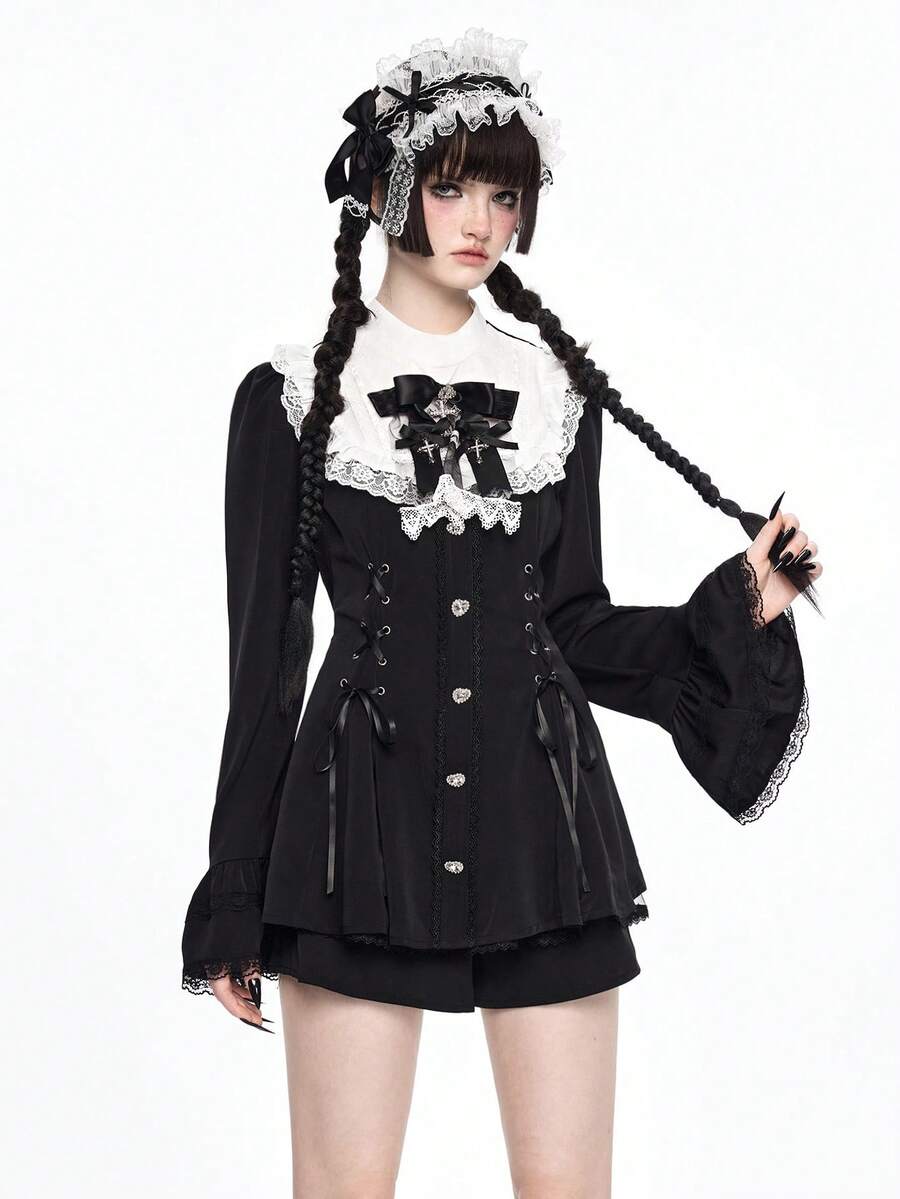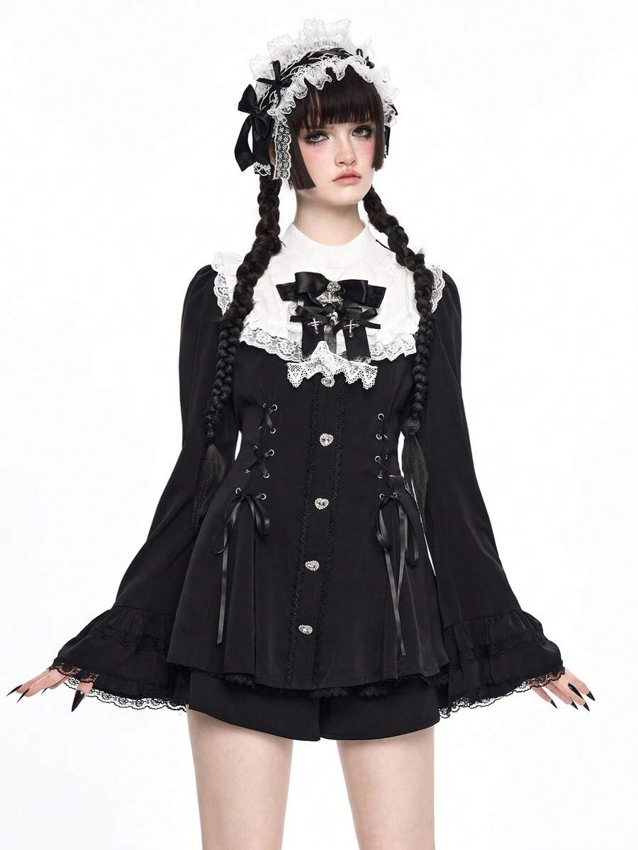 Goth Set da 2 pezzi composto da camicia aderente con colletto Peter Pan e fiocco, e pantaloncini, in stile gotico scuro con pendente a croce