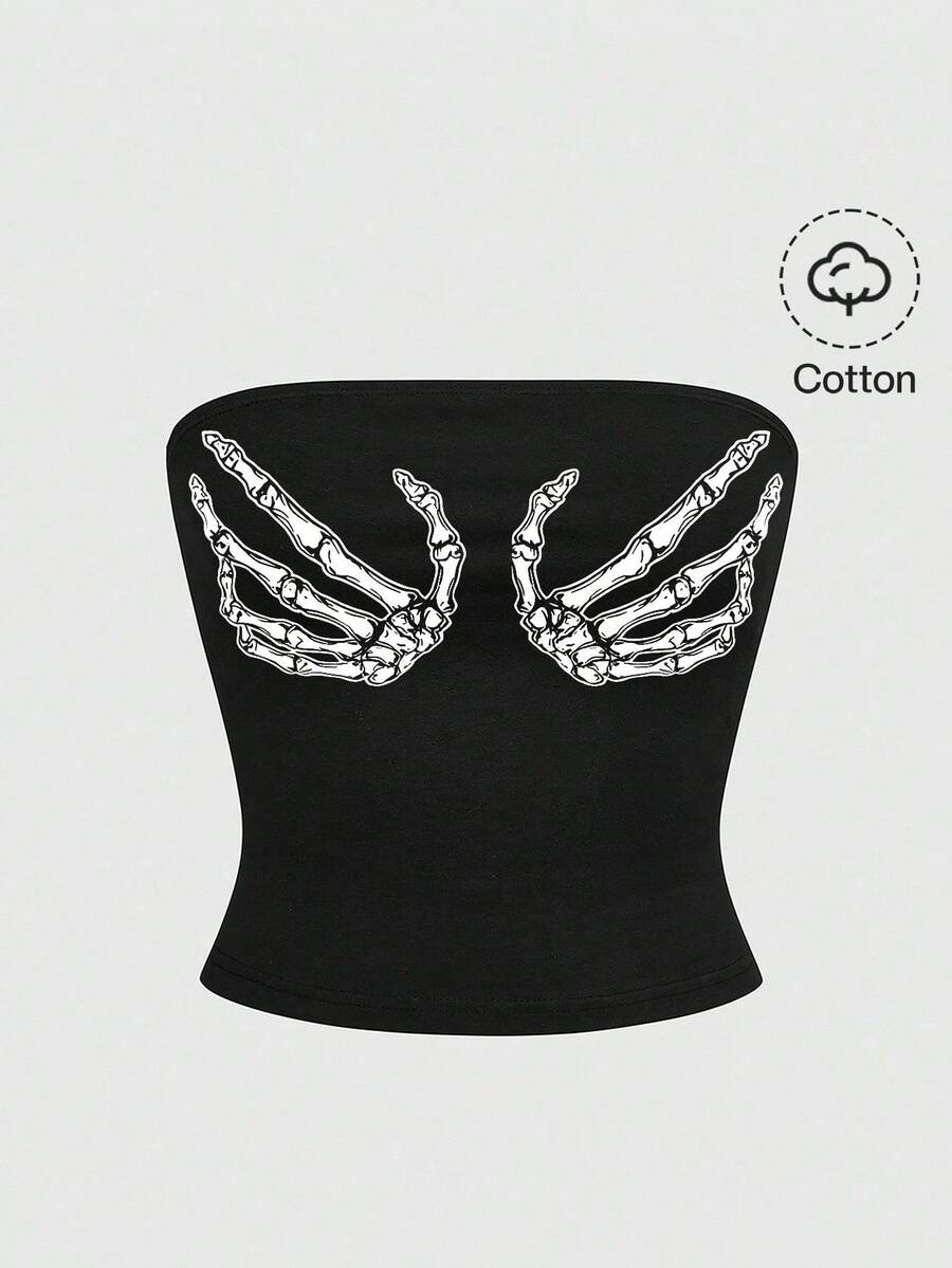Goth Maglietta con stampa di mano scheletrica, stile gotico orrore per Ognissanti