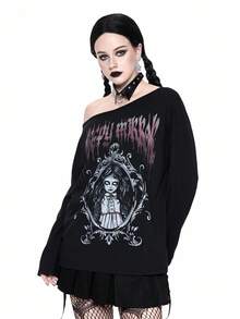 Goth Maglietta a maniche lunghe con stampa di bambole horror gotiche, scollo asimmetrico, per Ognissanti