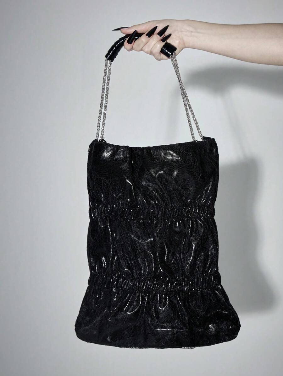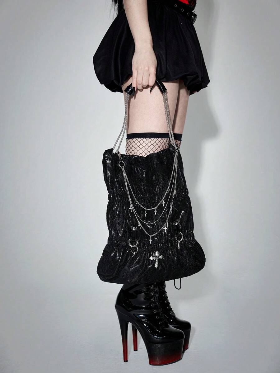 Goth Borsa a tracolla da donna con borchie a croce e teschio in stile gotico, secchiello con patchwork in pizzo scuro, adatta per Ognissanti