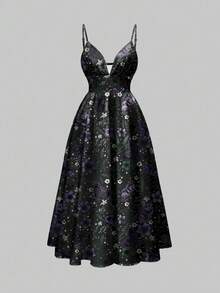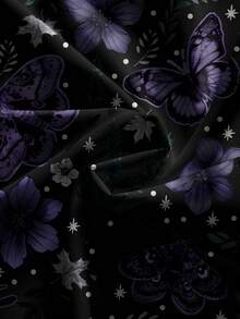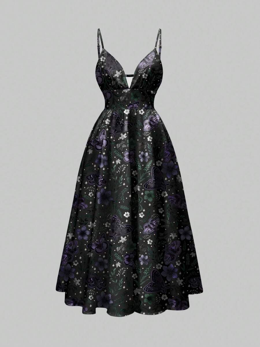 Fairycore Abito da donna romantico per vacanze, stile gotico e bohémien, con stampa misteriosa e scura di farfalle, falene e foglie in viola e blu, senza maniche, con scollo profondo e sexy