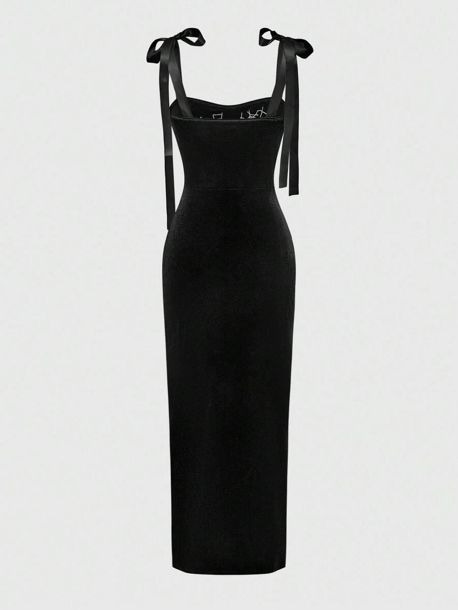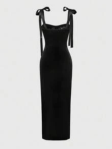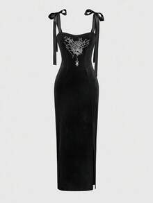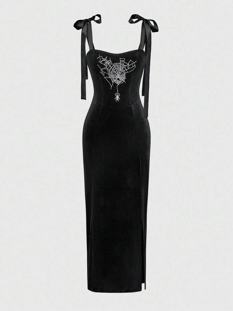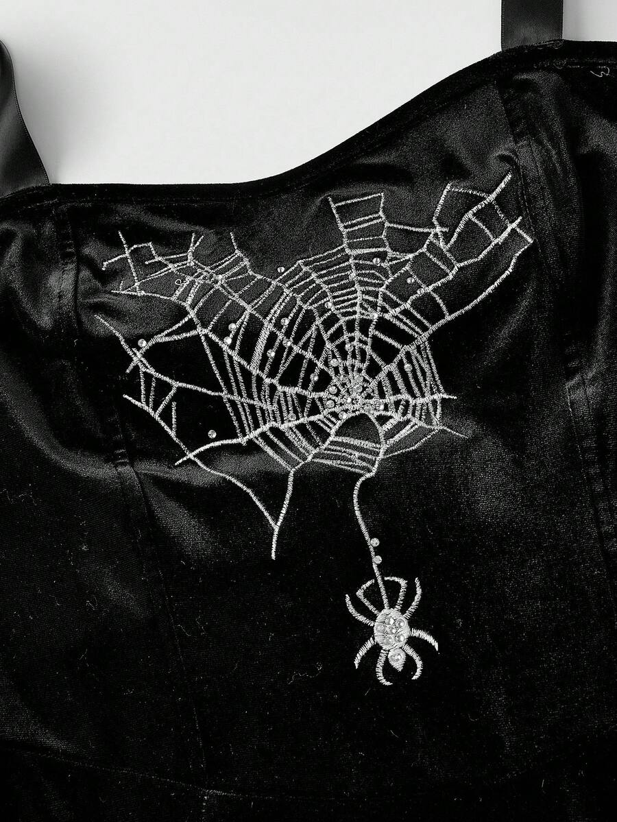 Goth Abito gotico da donna con scollo quadrato, ricamo di ragno, strass, allacciatura sul retro e spacco, adatto per Ognissanti