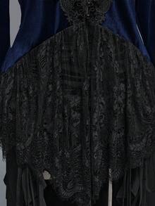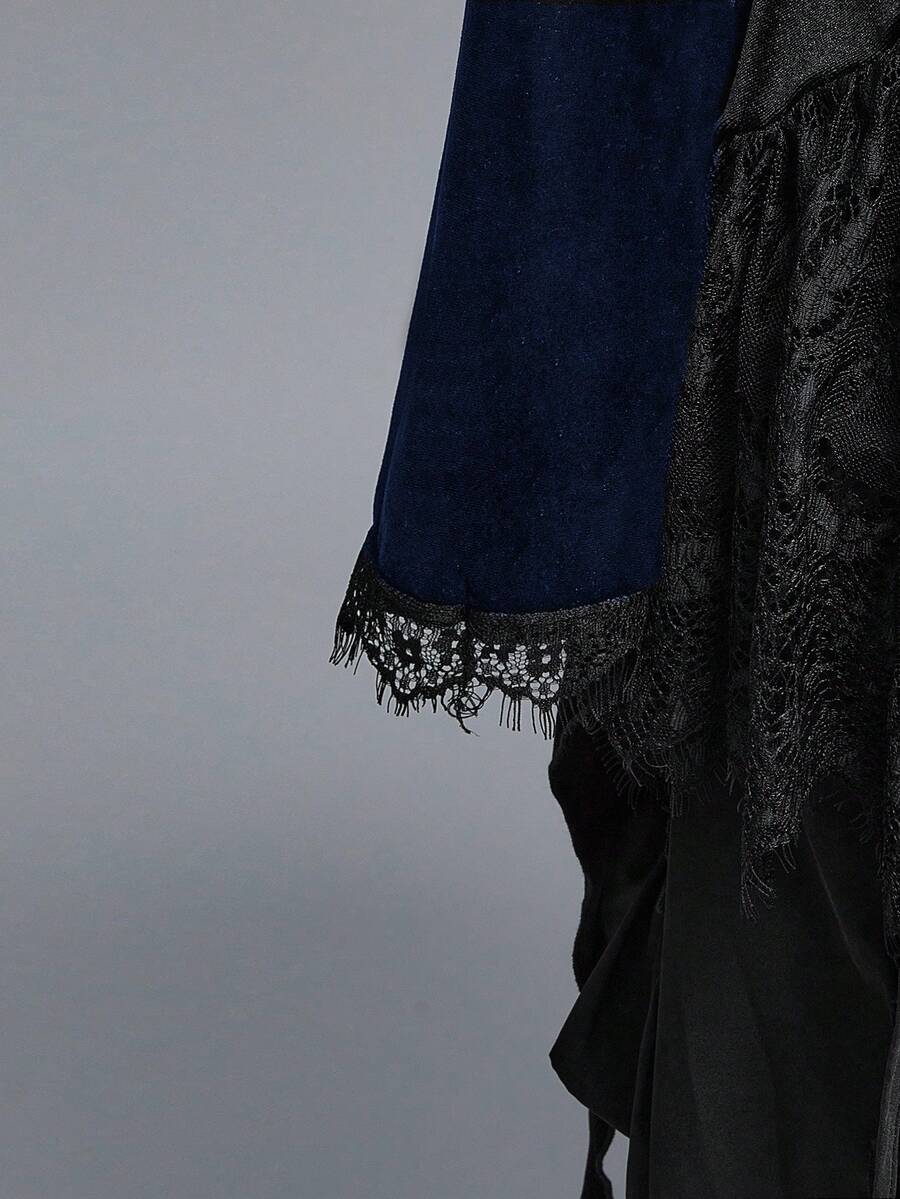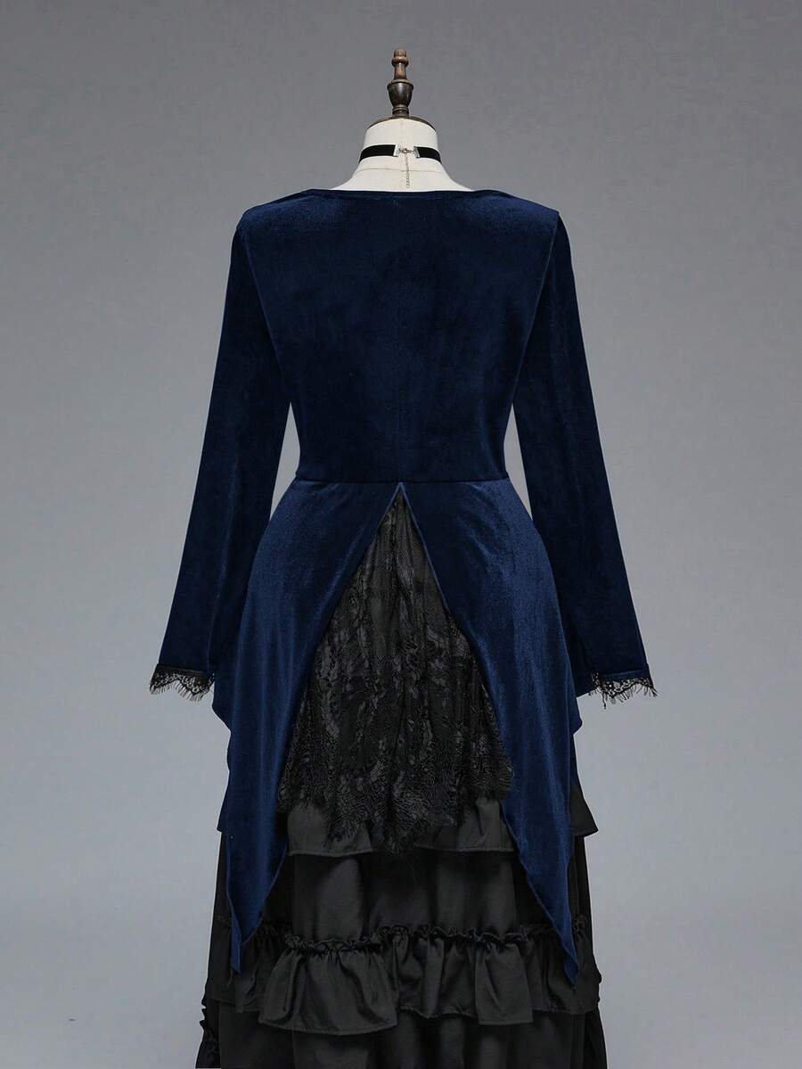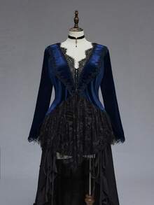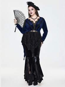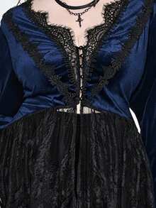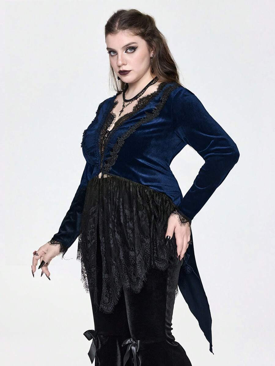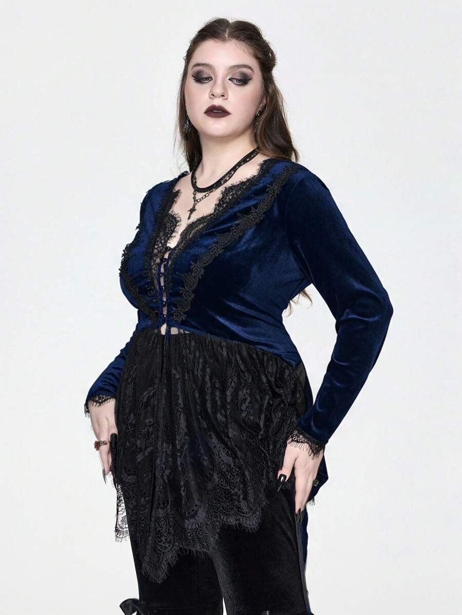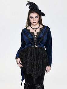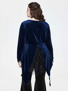Goth Top oversize in stile gotico con scollo a V profondo, orlo asimmetrico, in velluto con inserti in pizzo