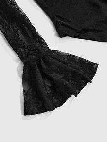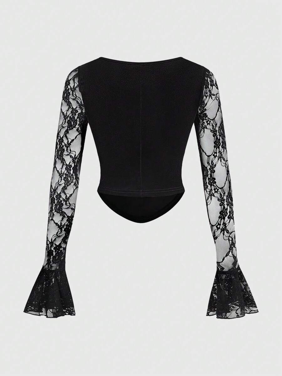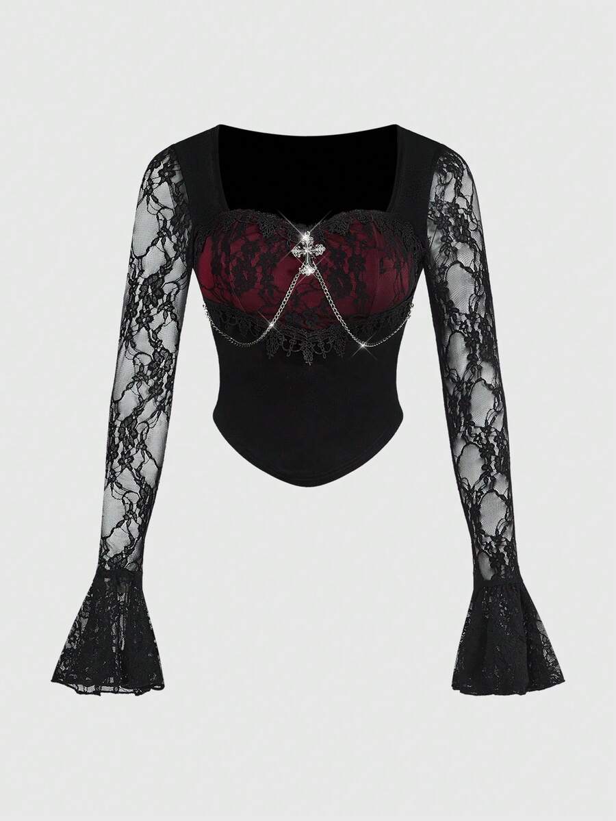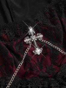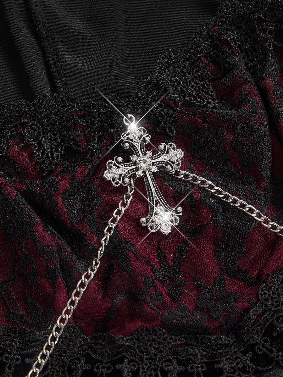 Goth Top da donna con colletto quadrato in pizzo a contrasto, pendente a croce e spacco alto, in stile gotico e regale