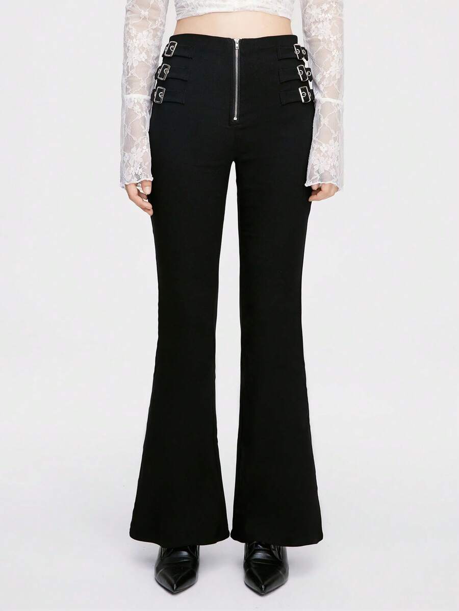 Goth Pantaloni a zampa da donna a vita bassa in stile gotico punk con cintura a fibbia in metallo sul lato