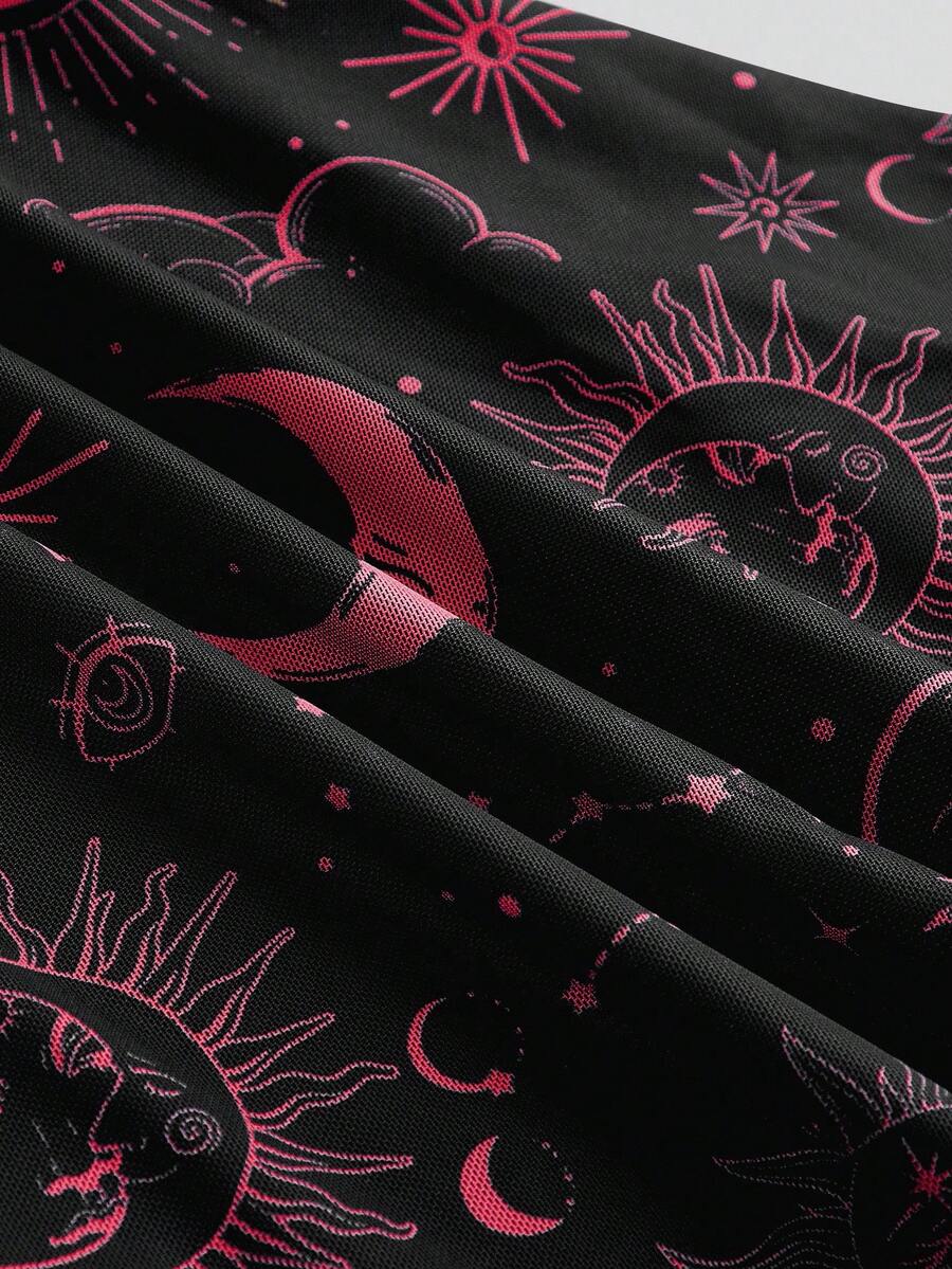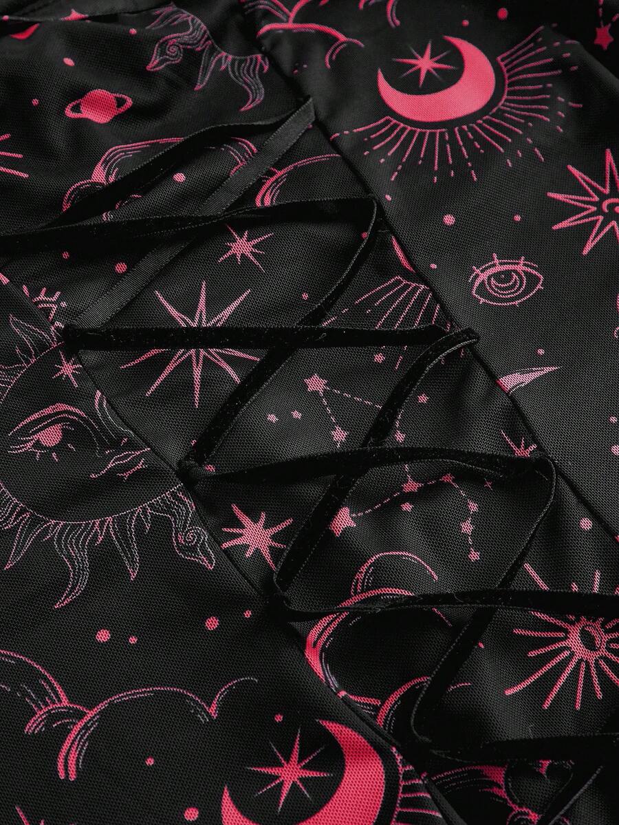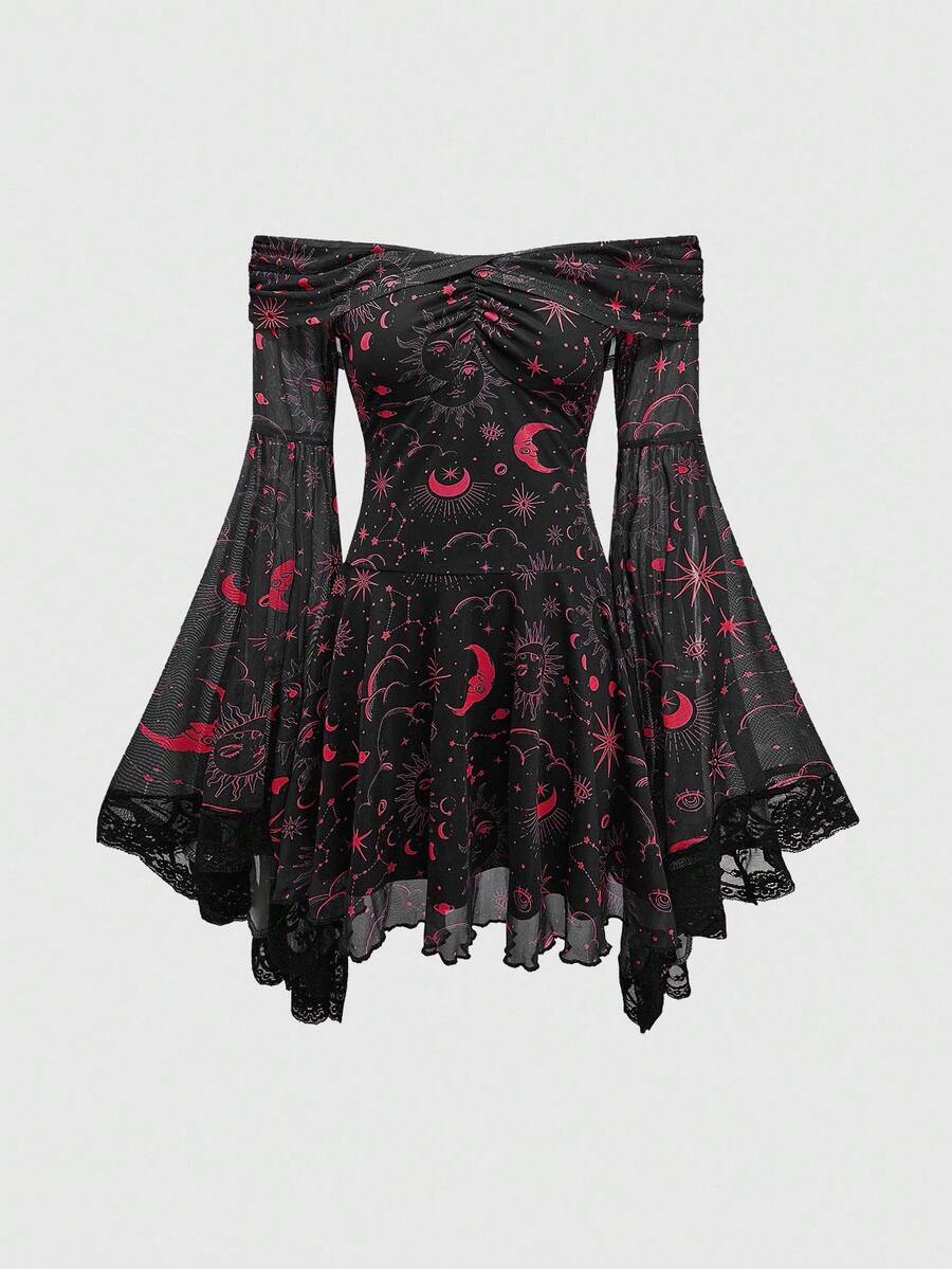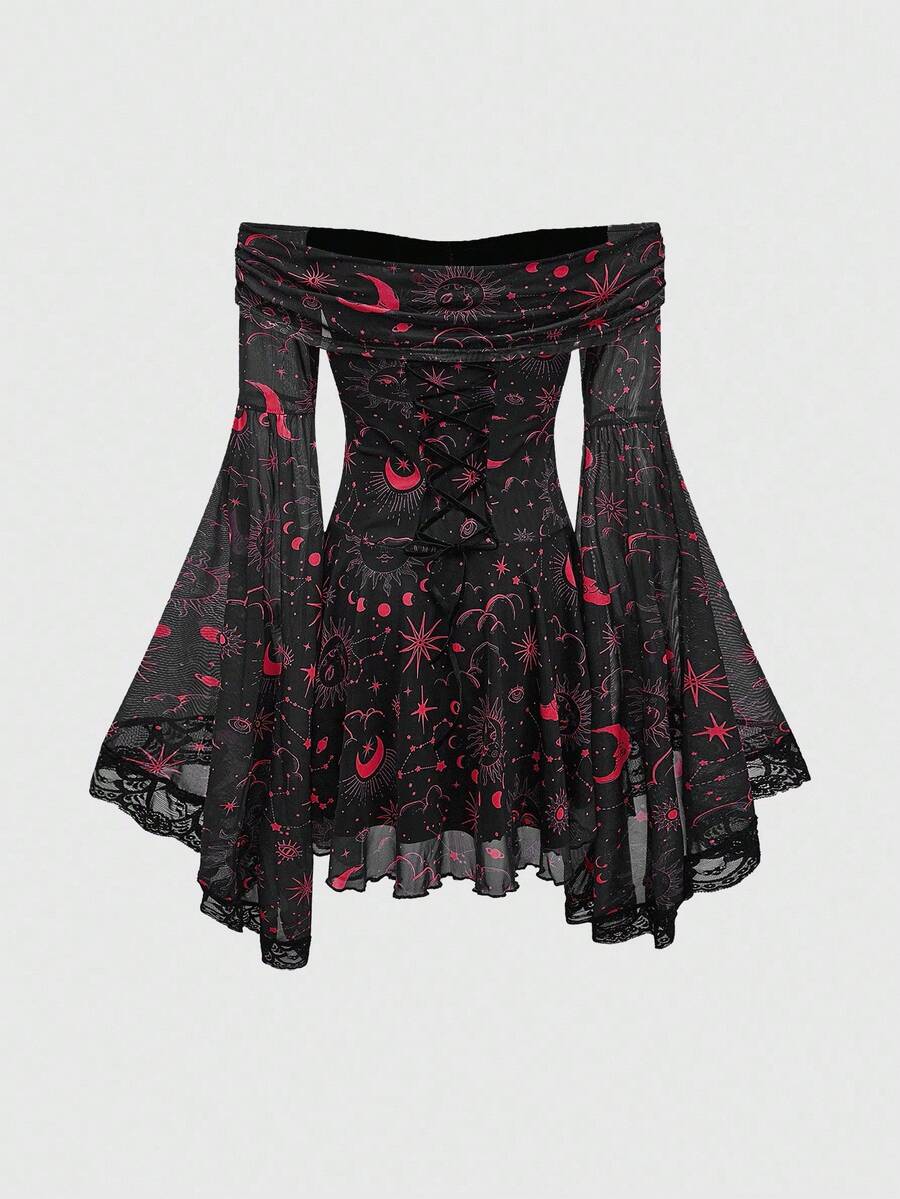 Goth Abito gotico retrò con stampa misteriosa di stelle e lune, scollo spalle scoperte, maniche a sbuffo in rete