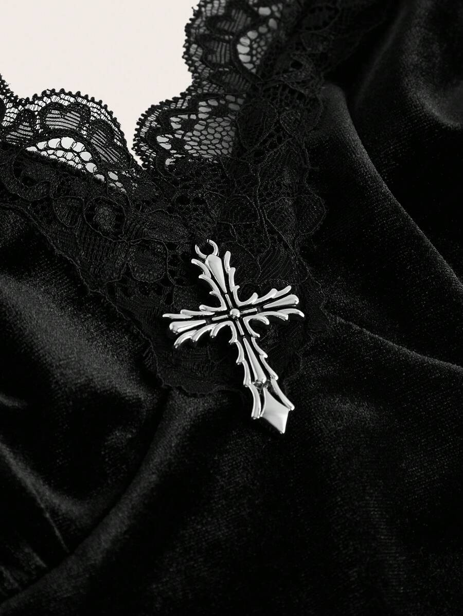 Gothic Sexy Top Corto In Velluto Con Orlo In Pizzo E Dettaglio A Croce In Metallo Per Donne