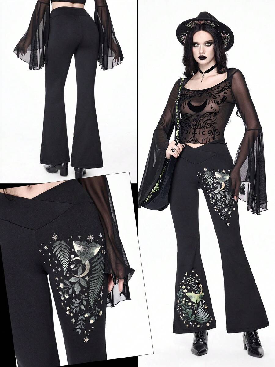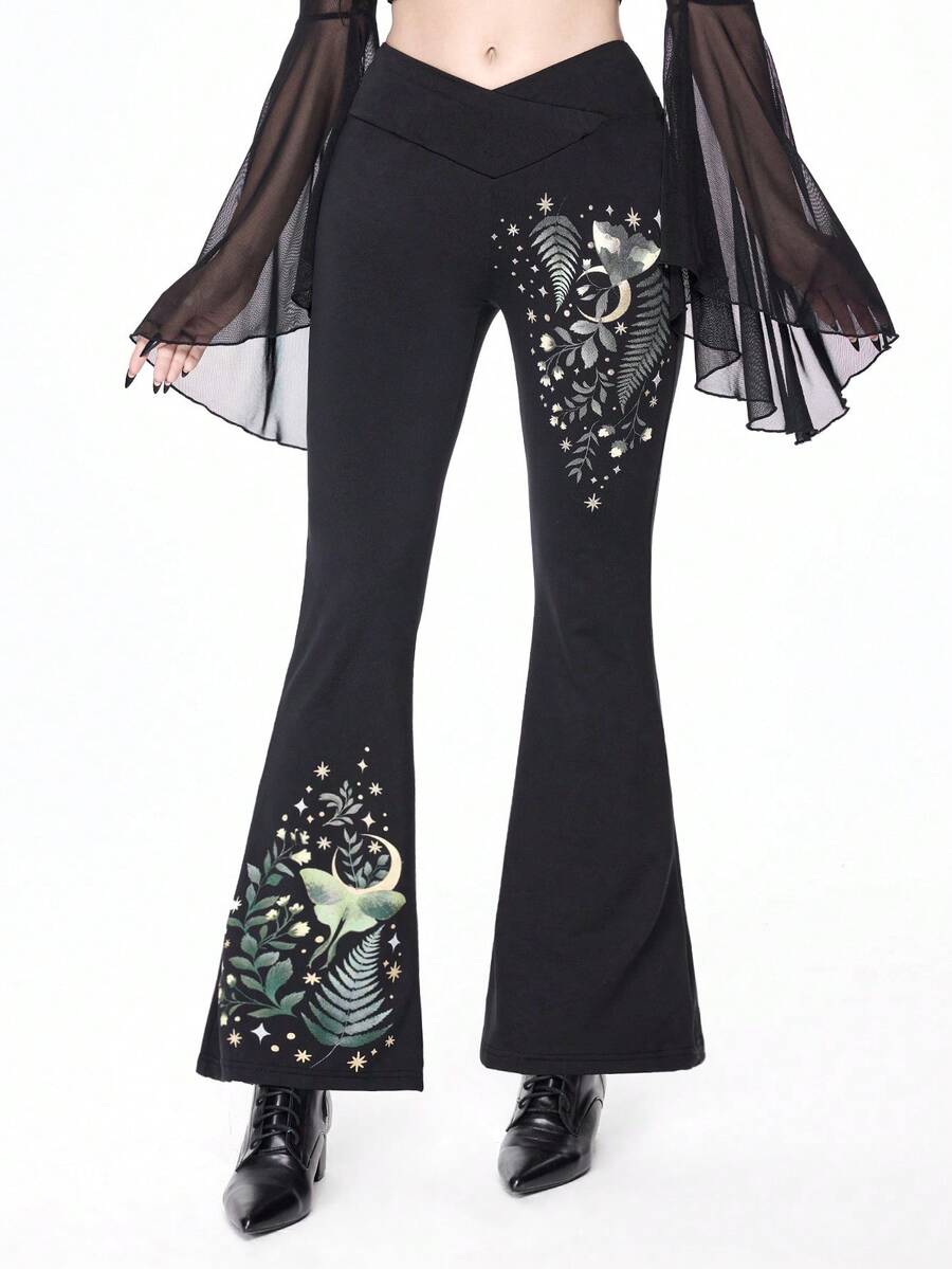 Goth Pantaloni a zampa da donna in stile gotico con stampa di piante, falene, lune e stelle