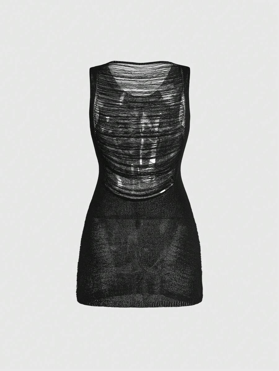 Goth Abito aderente e mini in stile gotico con ricamo di gatto a tre occhi, abito aderente lavorato a maglia con spacchi laterali strappati e senza maniche