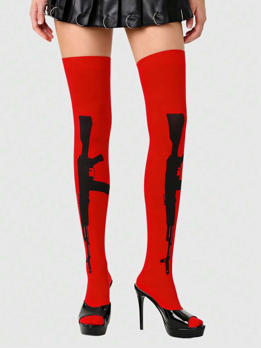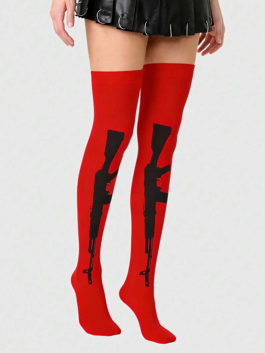 Grunge Punk 1 Paio di Calze al Ginocchio Punk Nere con Motivo Mitragliatrice Rossa