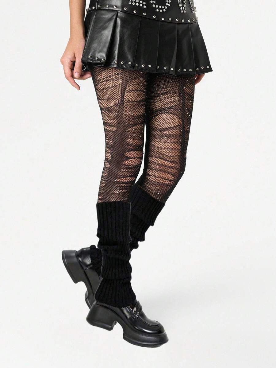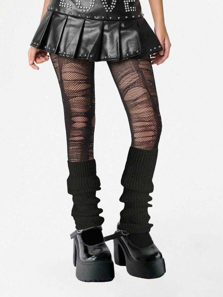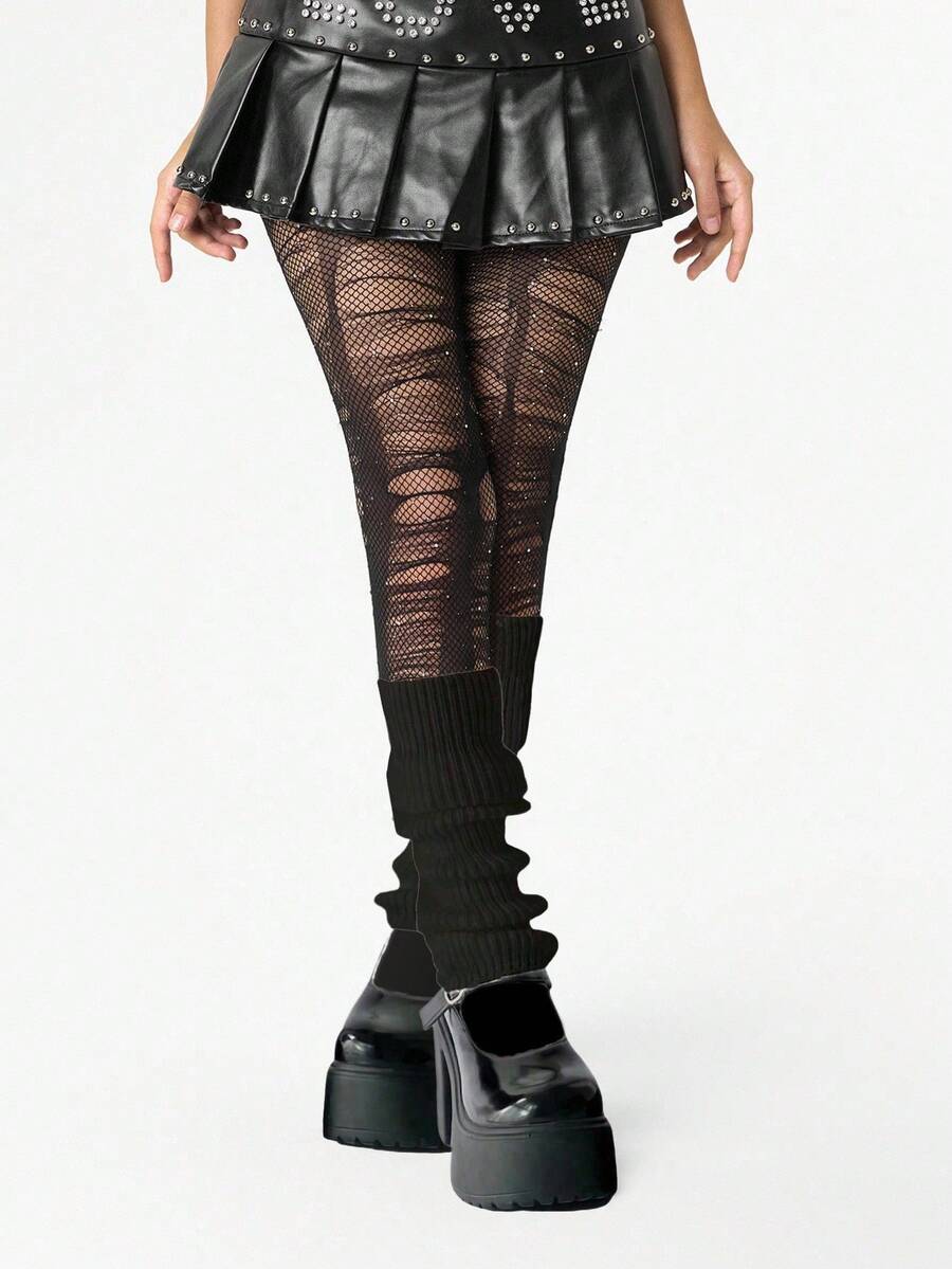 Grunge Punk 1 Paio Di Calze A Rete Nere Con Diamanti Stile Spice Girl + 1 Paio Di Coprigambe Neri Minimalisti, Set Combinato Di Calze A Rete E Calze In Stile Y2K, Adatto Per Combinazioni Di Danza Quotidiana