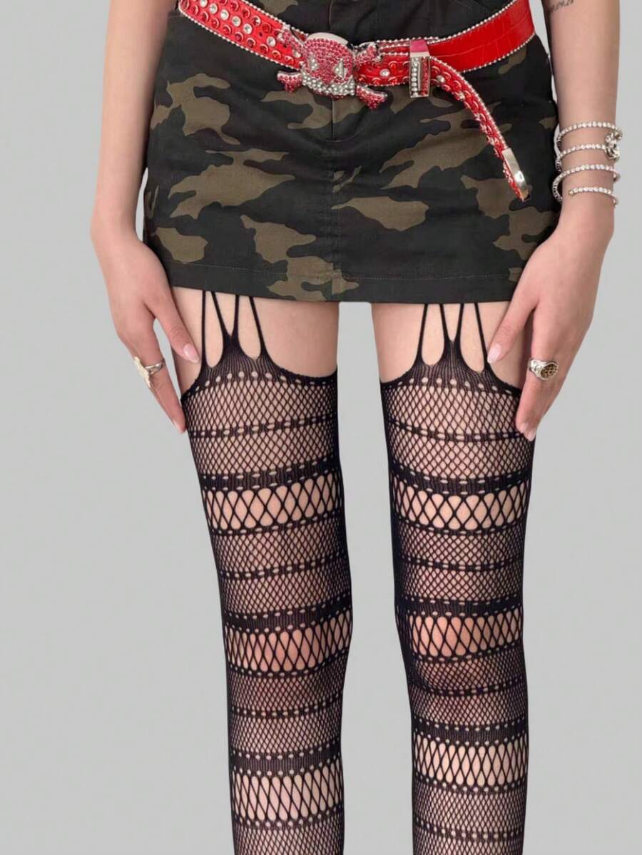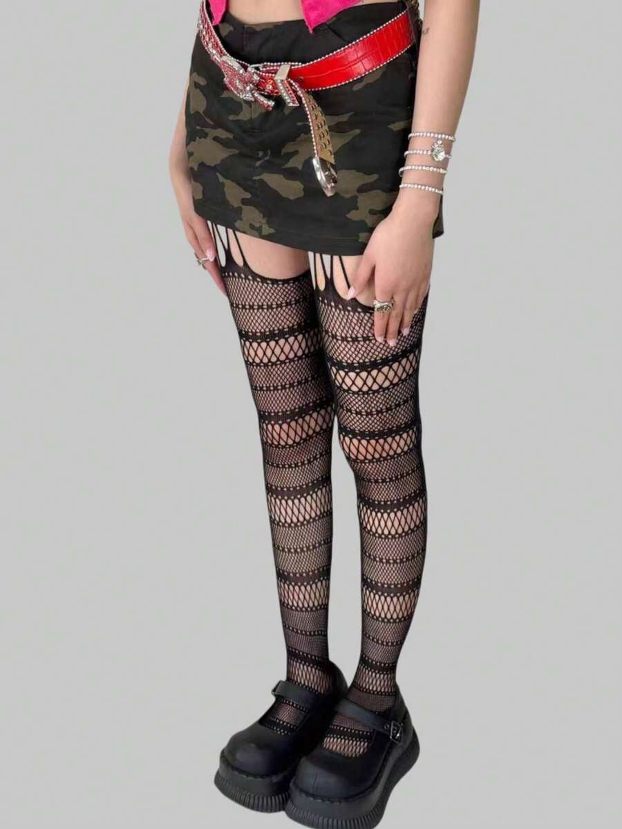 Grunge Punk 1 paio di calze a rete nere scure con motivo geometrico traforato