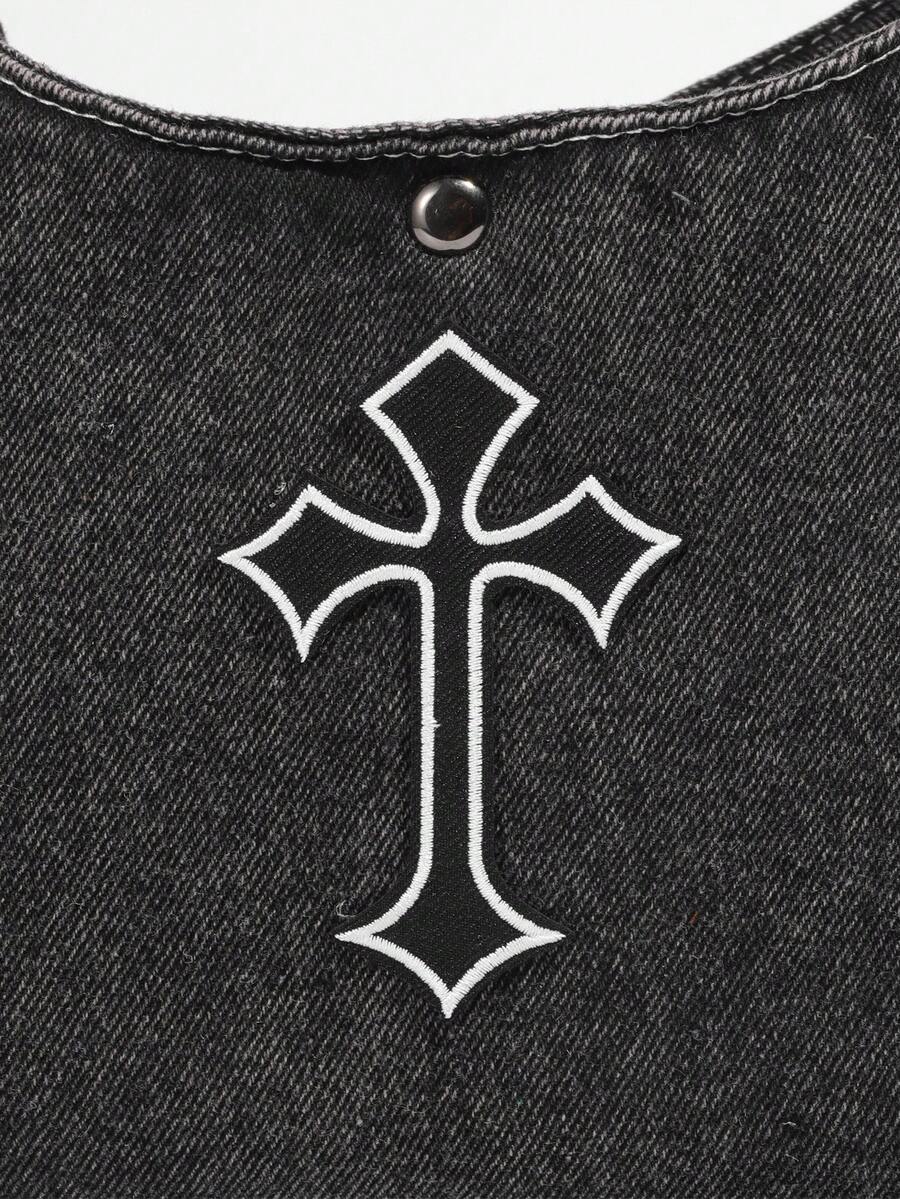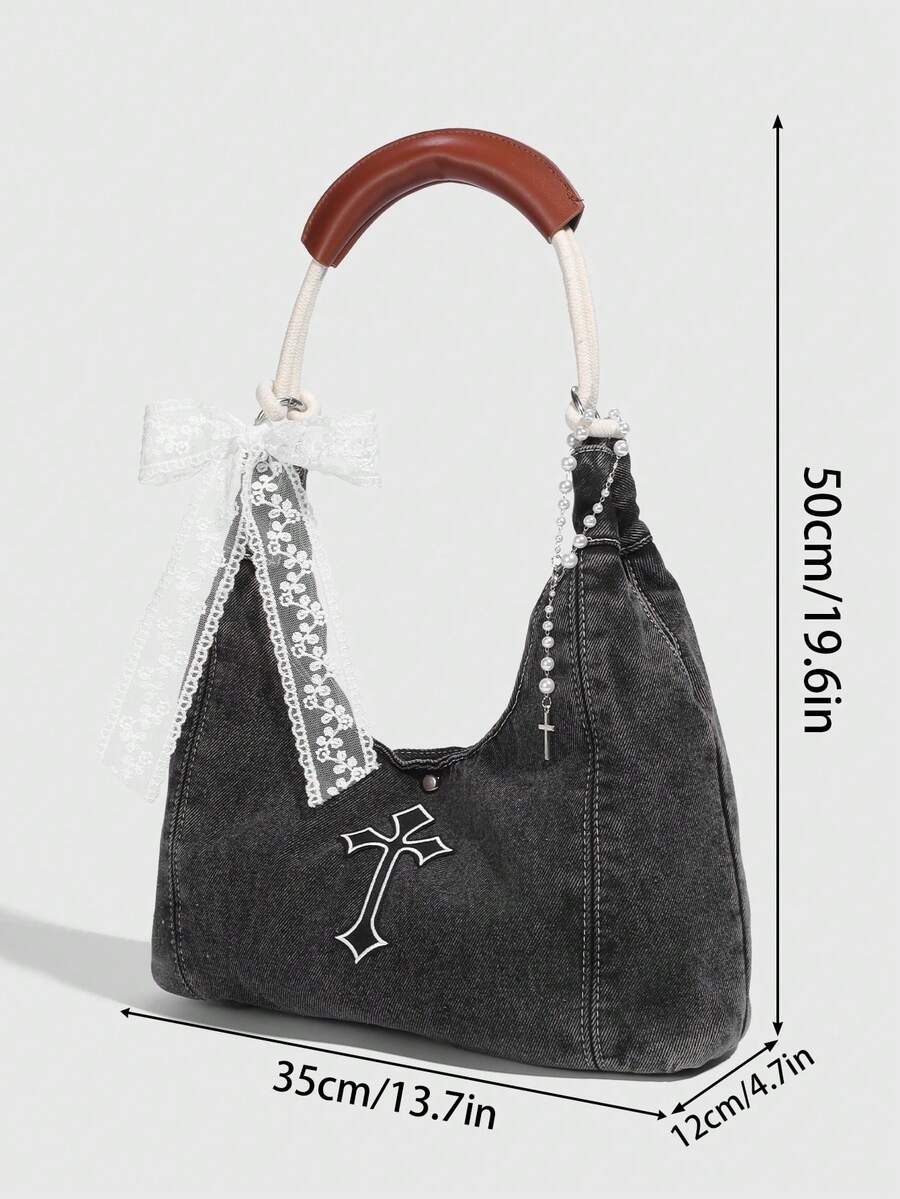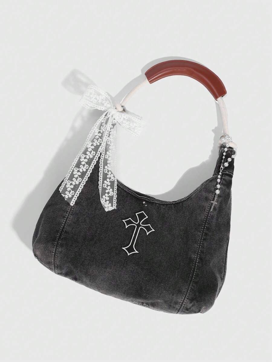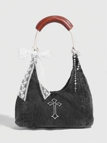 Grunge Punk 1 pezzo Borsa a mano retrò, borsa shopping decorata con colore a contrasto e fiocco di pizzo, stile dolce e cool, adatta per primavera ed estate