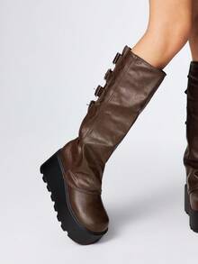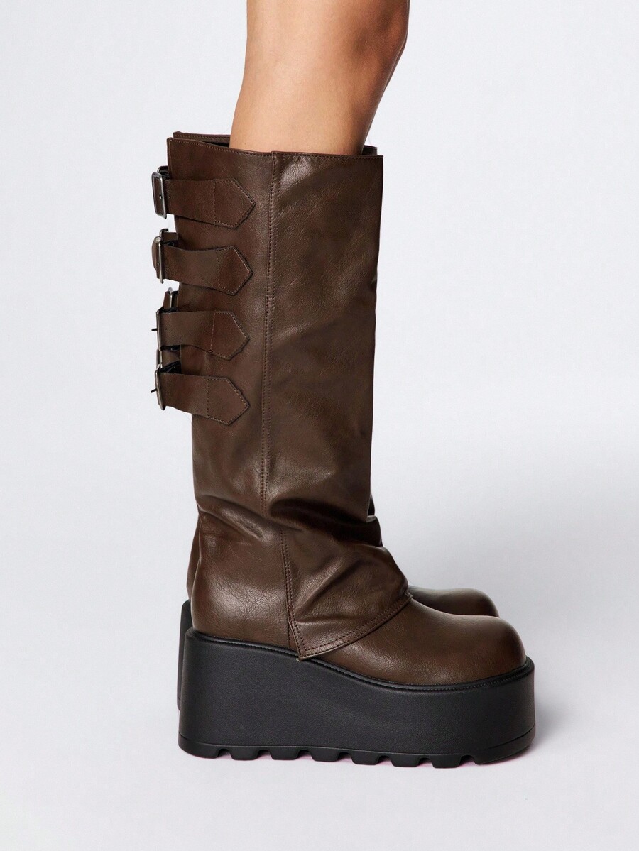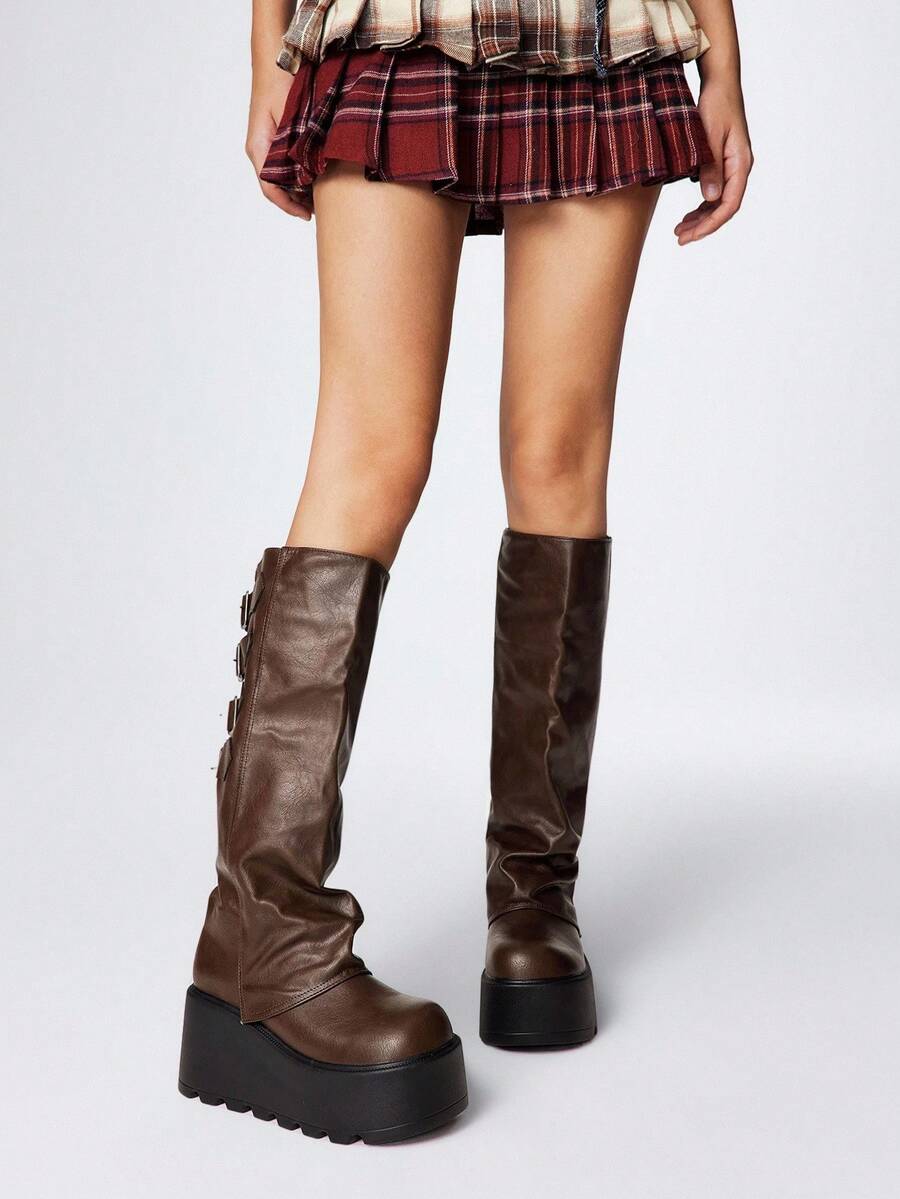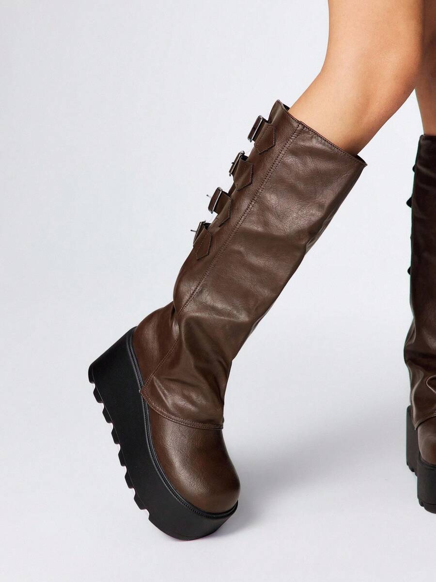 Grunge Punk Stivali alla caviglia in pelle marrone con punta tonda, suola spessa, stile punk con fibbia, tacco medio, adatti per l'uso all'aperto, nuovi per l'autunno/inverno 2025