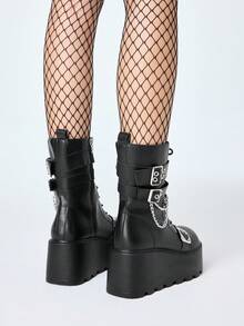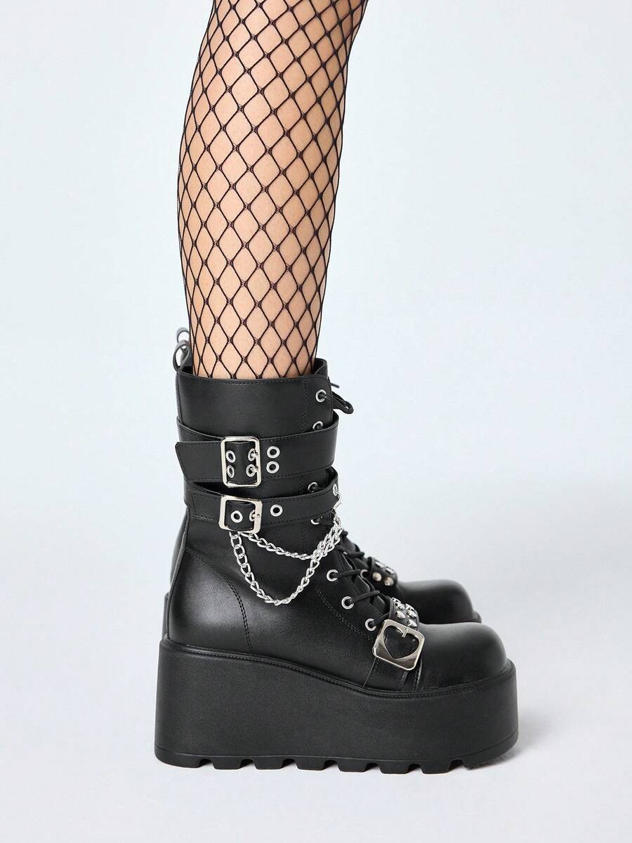 Grunge Punk 2025 Autunno/Inverno Nuovi Stivali con Punta Tonda, Stringati, Catena Punk, Suola Spessa, Stivali in Pelle da Esterno alla Moda, Slip-On Metà Polpaccio