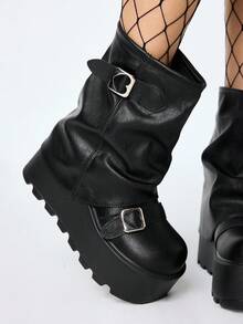 Grunge Punk Stivali alla caviglia con suola spessa, stile punk, con fibbia, per l'autunno/inverno 2025, stivali in pelle da esterno alla moda, slip-on, fino a metà polpaccio