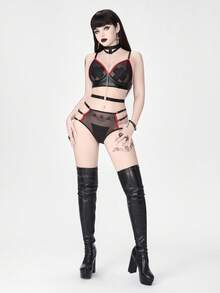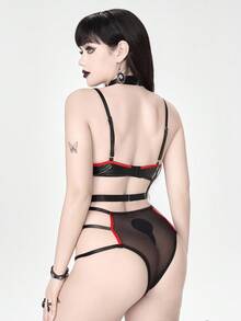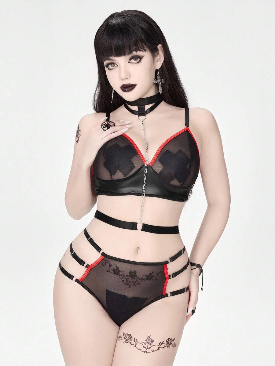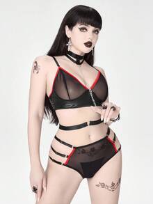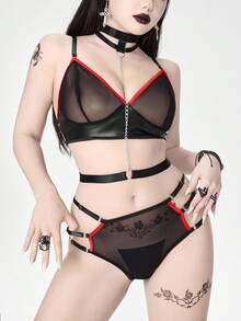 Grunge Punk 3 pezzi Set di lingerie sexy da donna in stile gotico punk, con reggiseno a triangolo in rete e PU a contrasto, perizoma a triangolo, catena metallica