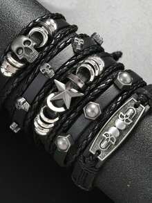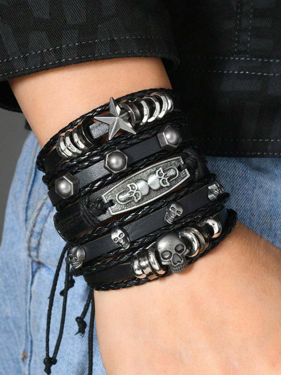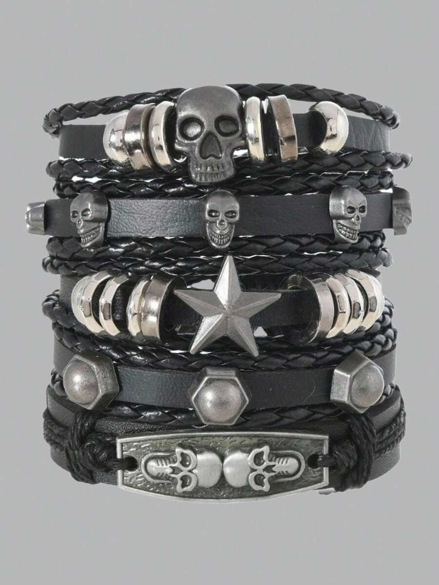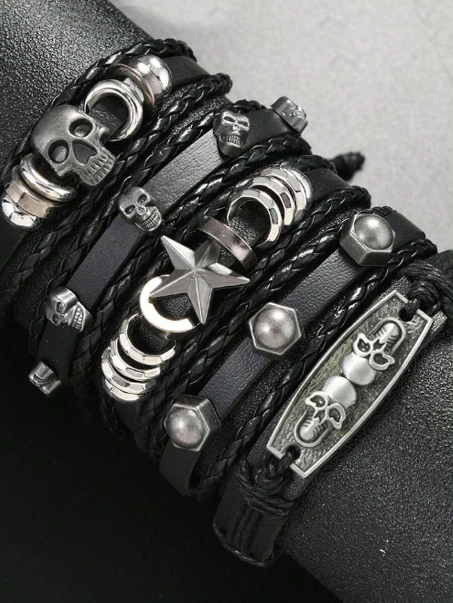 Grunge Punk Set da 5 braccialetti vintage in pelle PU con motivi gotici: pentagramma, teschio, cerchio, rivetti punk. Braccialetti intrecciati adatti agli uomini, ideali come regalo per feste, vacanze e Ognissanti.