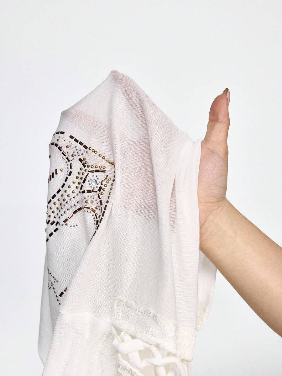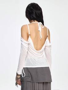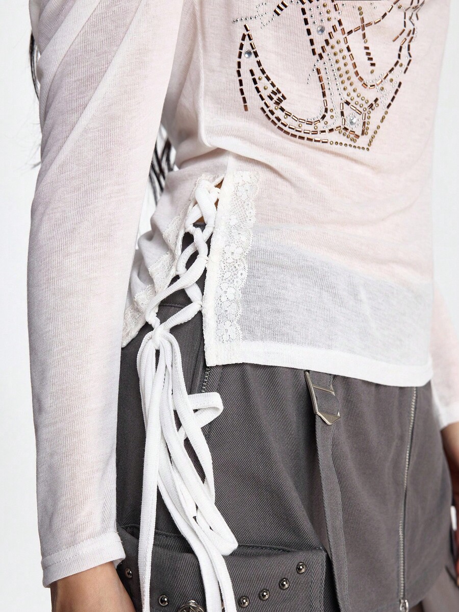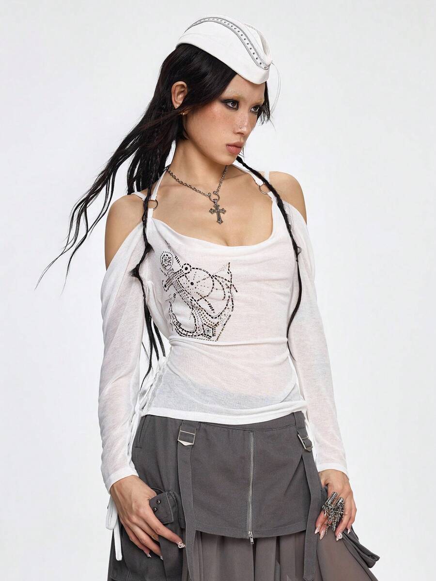 Grunge Punk Maglietta aderente a spalle scoperte con stampa a catena di ancora e decorazioni in strass