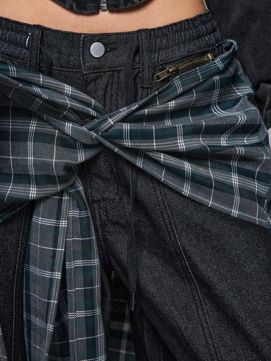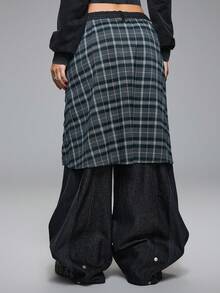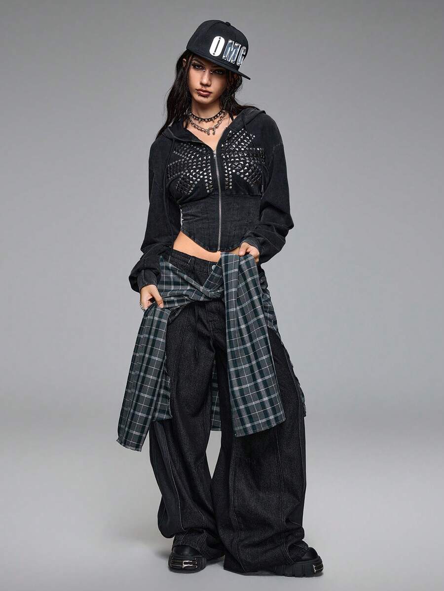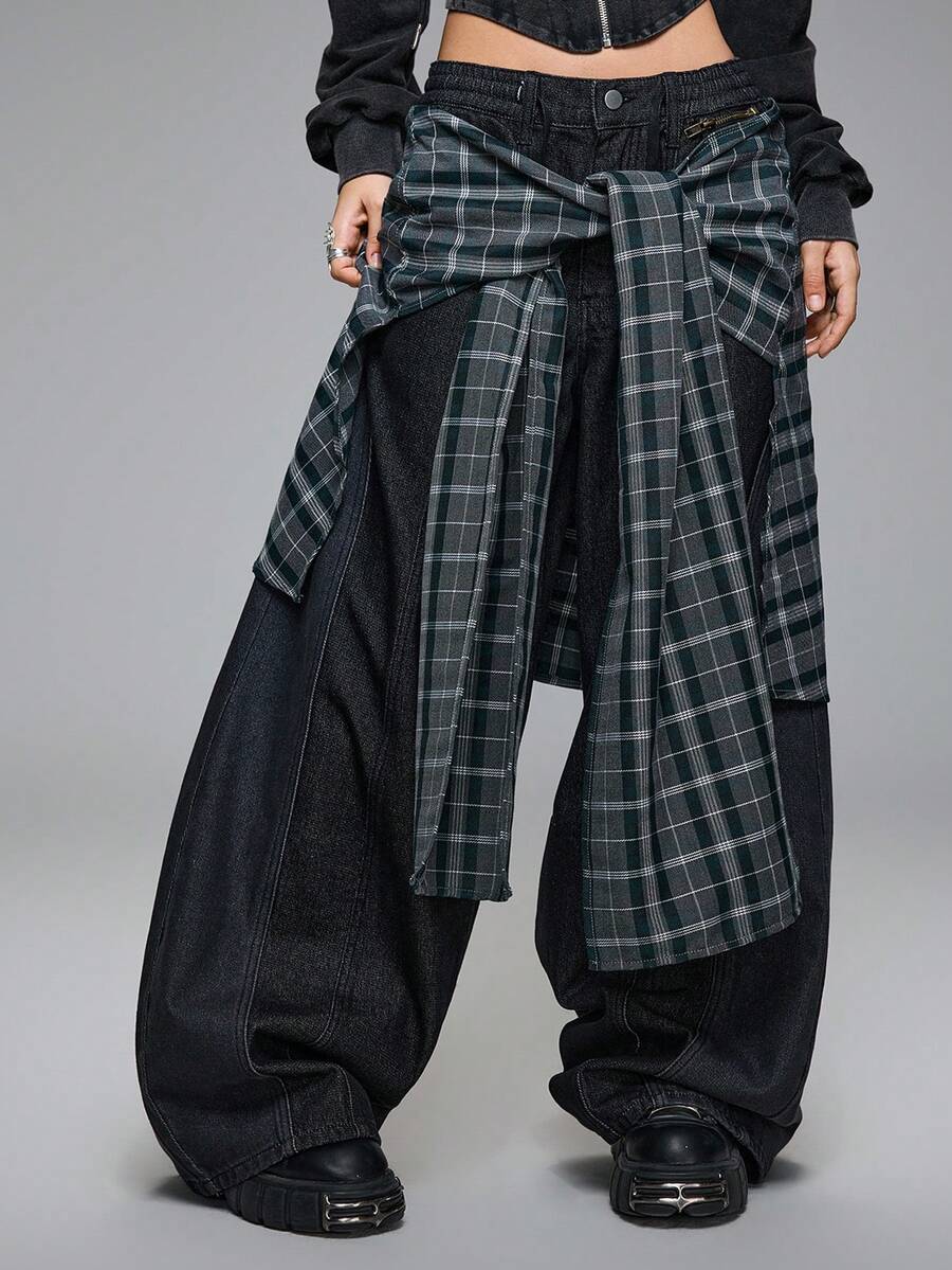 Grunge Punk Jeans larghi da donna a vita super bassa con design asimmetrico a patchwork a quadri neri e grigi, super morbidi