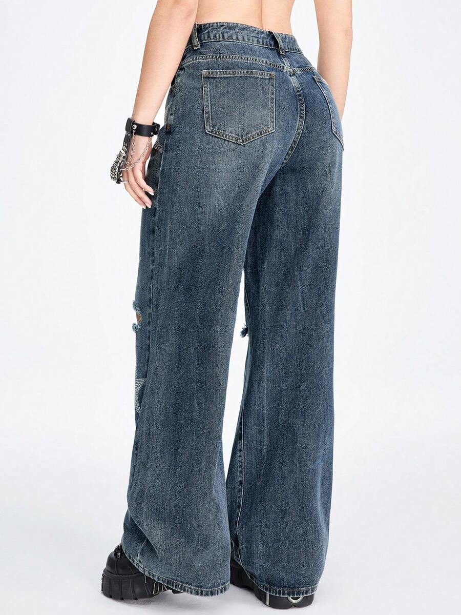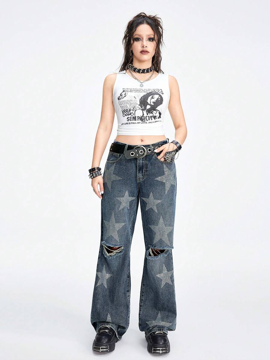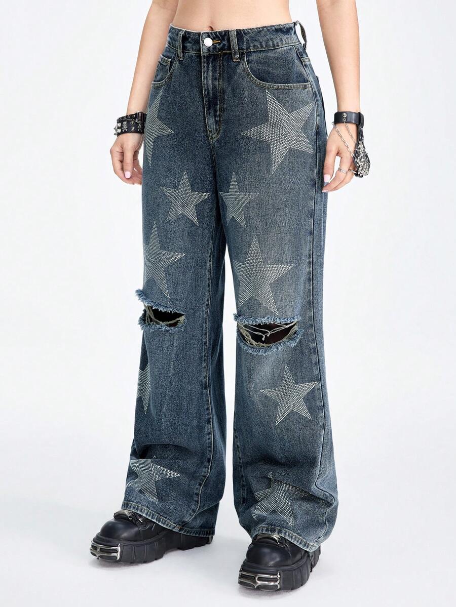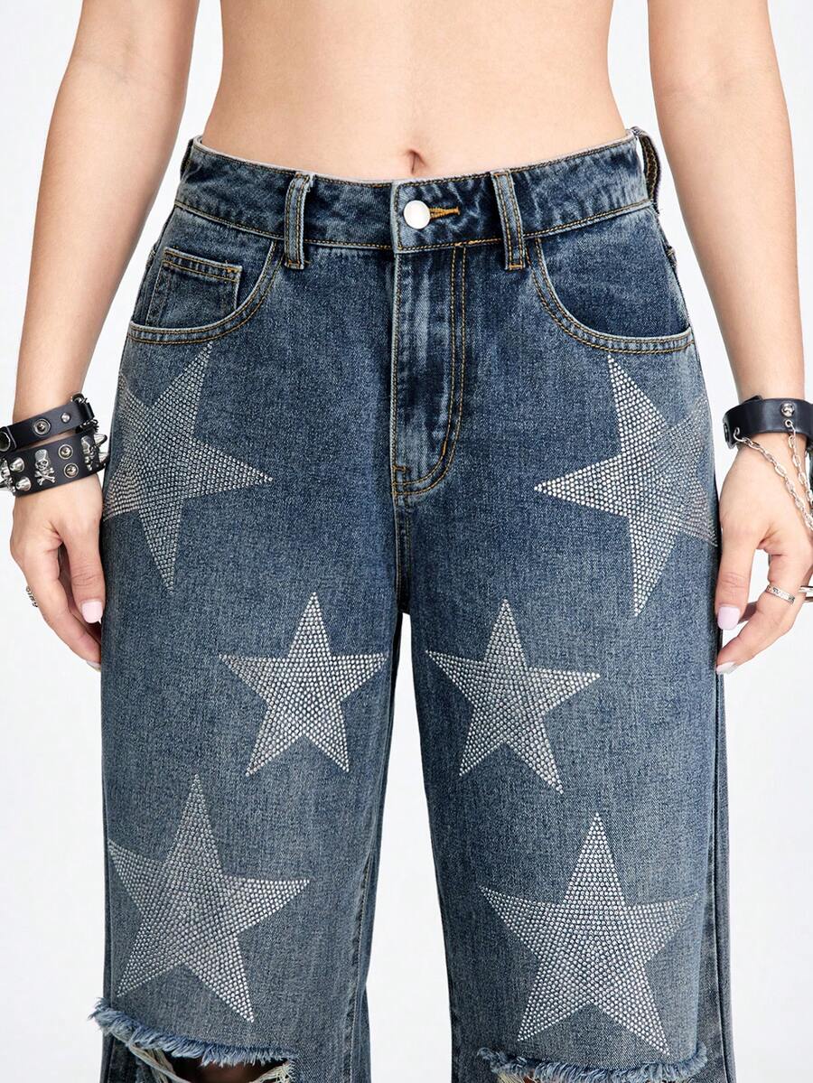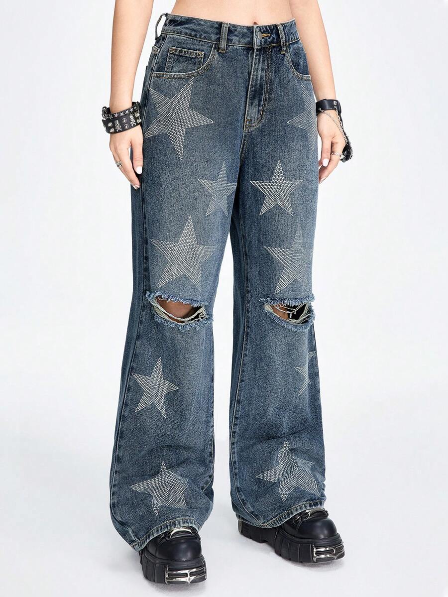 Grunge Punk Jeans ampi casual da donna a vita bassa con strass a forma di stella e effetto consumato