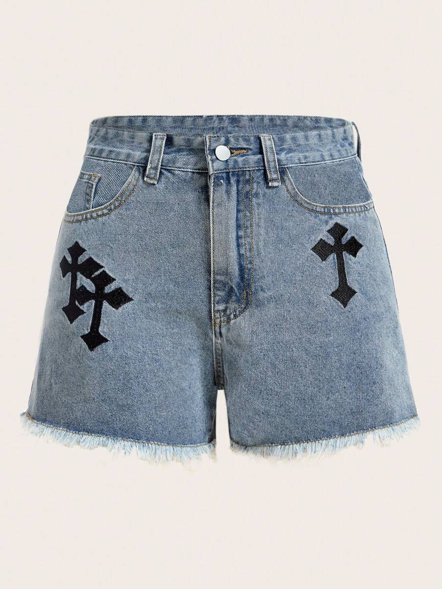 Grunge Punk Shorts in jeans con orlo grezzo e ricamo a croce, per la scuola