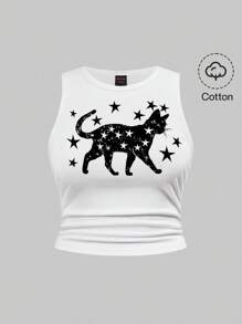 Grunge Punk Top in cotone bianco con stampa di gatti e stelle, stile punk e di strada Y2K, disponibile anche in taglie comode