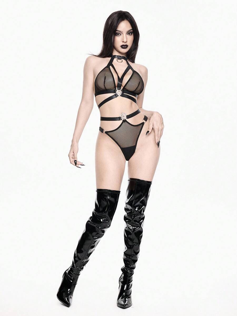 Grunge Punk Set di lingerie composto da reggiseno a triangolo con coppa in rete a forma di stella a cinque punte e slip, intimo sexy