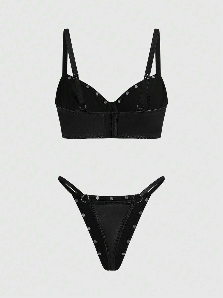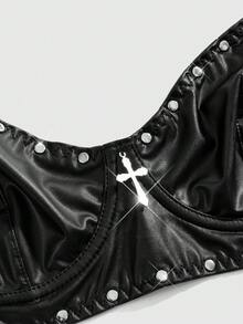 Grunge Punk Set di lingerie sexy in PU scuro con borchie, reggicalze con stecche, reggiseno a balconcino